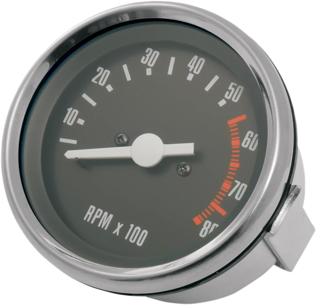 Original-style tachometer, manufactured to exact OEM specifications. Features an 8000 rpm face and a stainless steel bezel. 2-3/4" diameter body. Also replaces stock '74-'75 FX tachs by wiring impulse lead to points side of coil rather than alternator. Bulb and socket not included.