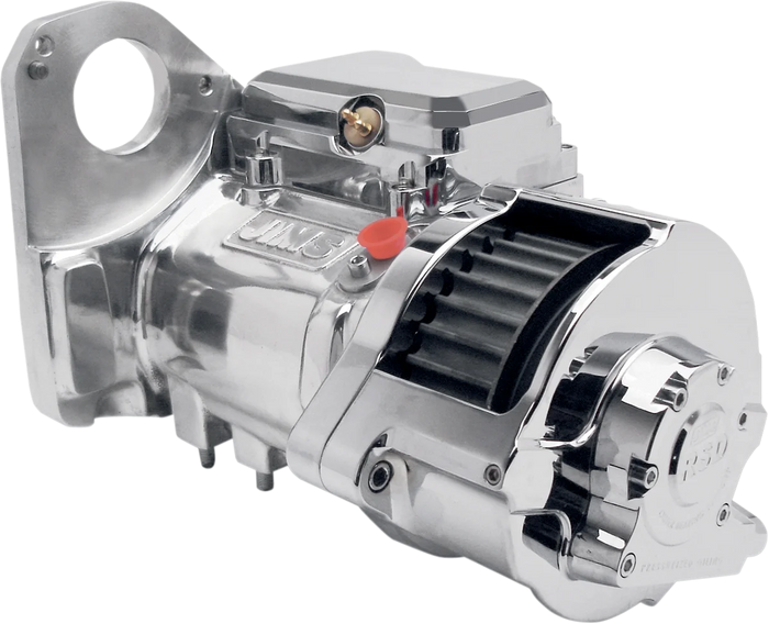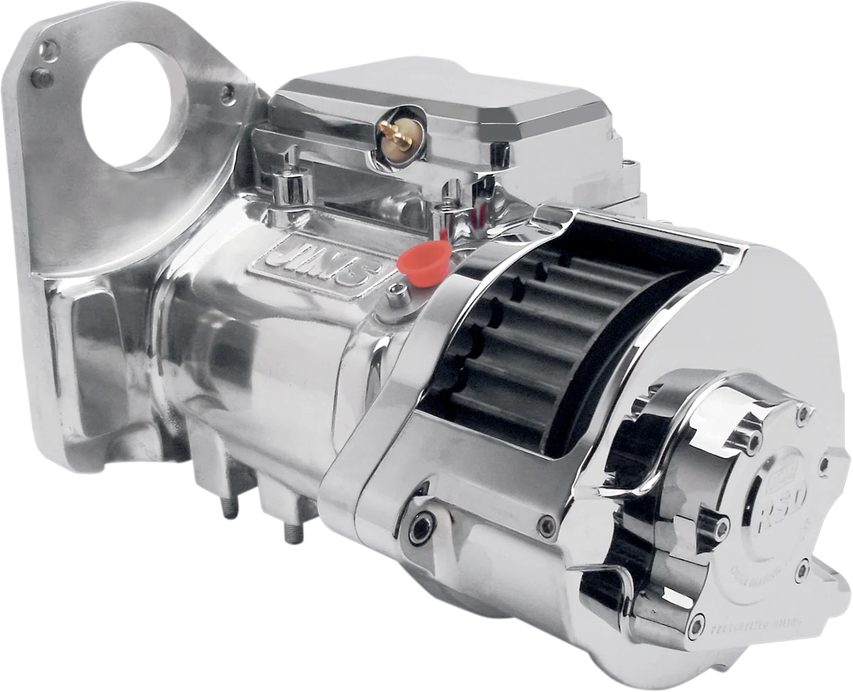Innovative design is both durable and very strong. Shipped with CNC-machined billet aluminum top cover. Output main shaft support bearing that minimizes flexing of the main shaft. Built-in oil pump for lubrication of the output main shaft bearing. Polished case. Includes hydraulic clutch. All parts are made in the U.S.A. and assembled in JIMS technologically advanced facility. Transmission is not compatible with stock chassis and modifications will be necessary.. For '90-'99 RSD Evolution-style Softail applications..