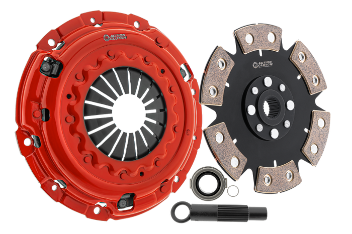 Action Clutch's Stage 4 (1MD) Clutch Kit is designed to withstand even the most challenging conditions. Featuring a heavy-duty single diaphragm pressure plate, reinforced drive straps, and an Unsprung MIBA Ceramic (available in a 4 or 6 puck) disc, this kit provides peak performance and extreme durability for low/mild horsepower vehicles. Our Unsprung MIBA Ceramic clutch kit provides quicker engagement and will introduce some clutch chatter, which will minimize after proper break-in. For those looking to take their dedicated race vehicles to the next level, the Stage 4 (1MD) Action Clutch Kit provides maximum control and power with little compromise on reliability. At Action Clutch, every kit is quality checked by one of our experienced engineers (with over 60 years of collective experience) and signed off as safe before being released as a finished product. This gives you peace of mind knowing that your Action Clutch will perform consistently every time. NOTE: Purchasing the wrong type of clutch kit for your specific engine power output can result in premature clutch failure, damage to the transmission and void warranty eligibility. If you're unsure what kit is right for you, contact Action Clutch direct. 170% INCREASED HOLDING CAPACITY OVER FACTORY KIT RACE APPLICATIONS / DRAG / ROAD / DRIFT RACING