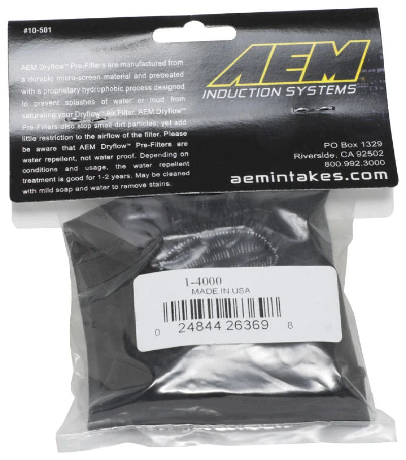AEM Dryflow Pre-Filters are manufactured from a durable micro-screen material and pretreated with a proprietary hydrophobic process designed to prevent splashes of water or mud from saturating your Dryflow air filter. AEM Dryflow Pre-filters also stop small dirt particles; yet add little restriction.