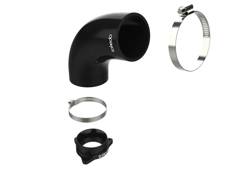 This turbo inlet is the perfect addition to the Takeda intake. It removes the air flow restriction of the factory turbo inlet and guarantees the maximum air flow to the turbo for maximum power. It provides a smooth transition for the air from the Takeda air intake tube to the turbo with the minimum restriction. Precisely CNC machined out of 6061-T6 billet aluminum, the adapter mounts directly onto the turbo and guides the increased air flow from the Takeda intake into the turbo. It is black anodized for durability and a stealthy appearance. This turbo inlet utilizes a flexible silicone coupling that is reinforced with three layers of polyester material, making it resistant to wear and deterioration. The silicone coupling mates directly to the aluminum turbo adapter and the Takeda air intake tube. All necessary clamps are provided. All necessary clamps and hardware are provided for a fast and easy installation. The factory harness bracket mounts directly onto the aluminum adapter for perfect fitment. This item will only fit with Takeda air intake systems P/N: 56-10021D , 56-10021R, 56-70021D and 56-70021R . It will NOT fit with the factory air intake system. For use with factory air intake system, see part number 59-20001.