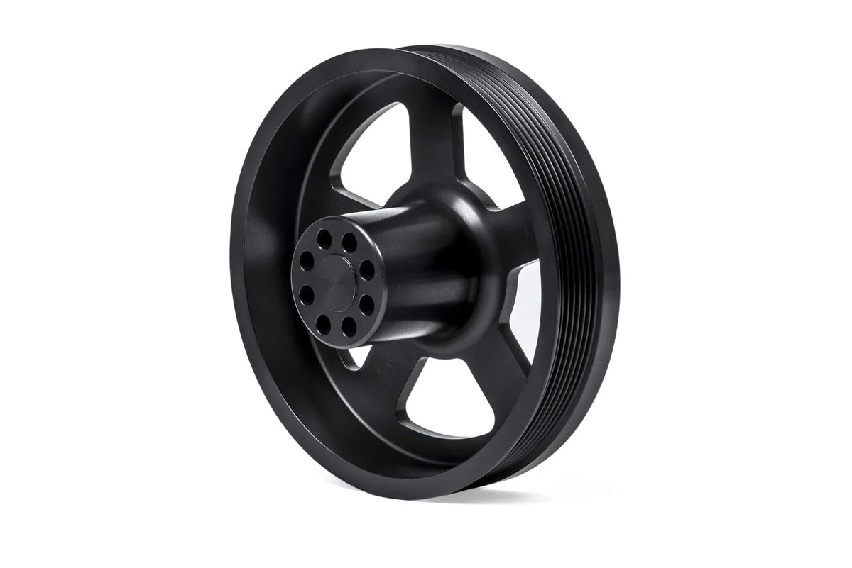 | Description_MKT | APR's Supercharger Crank Pulley Upgrade increases the diameter of the factory pulley from ~162mm to ~187mm, which in turn spins the supercharger ~15.4% faster. This results in a larger bump in horsepower and torque across the entire RPM range, as the supercharger is spinning at an even higher rate of speed. The pulley retains the factory harmonically balanced crank pulley and bolts on top of the existing unit. It is CNC machined from light weight billet aluminum with weight saving pockets throughout. It has an anodized black finish and includes new crank pulley bolts. |