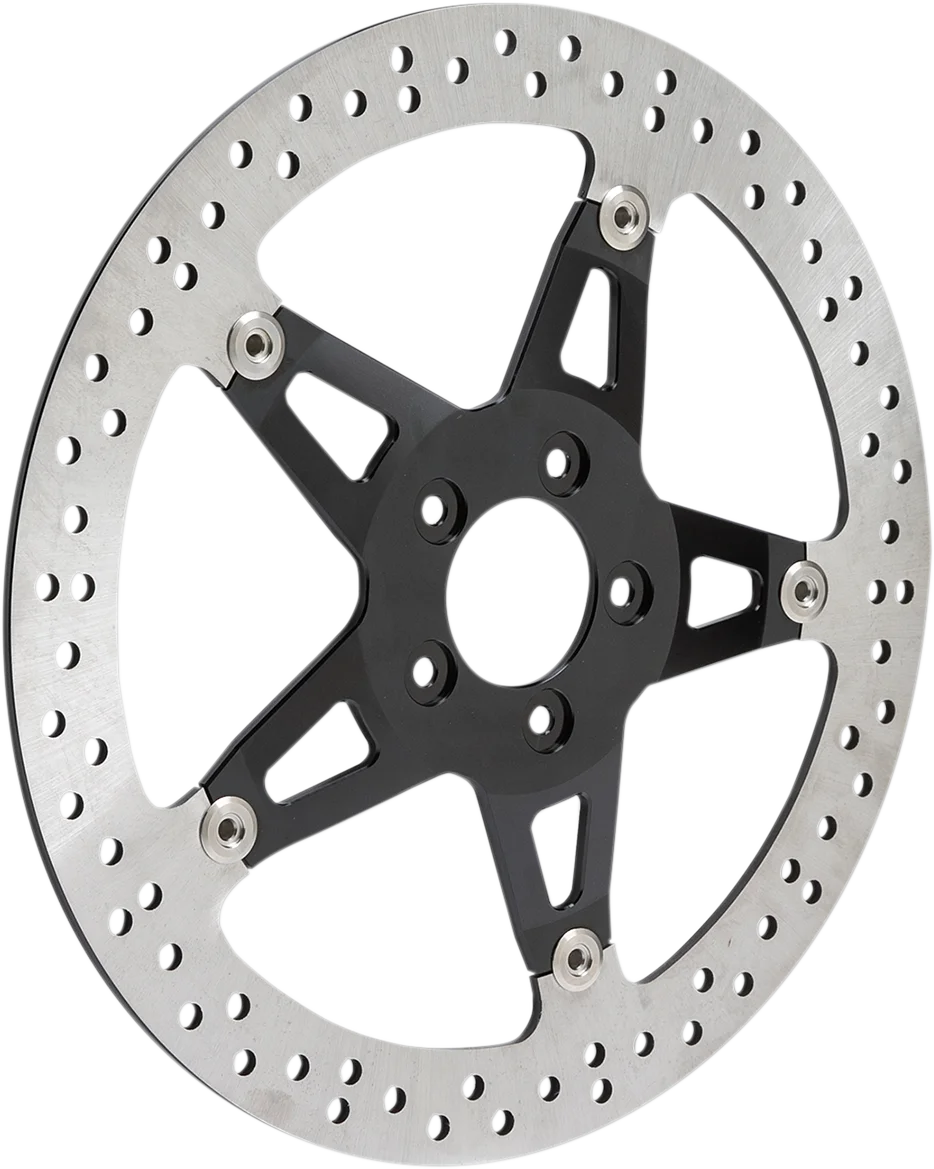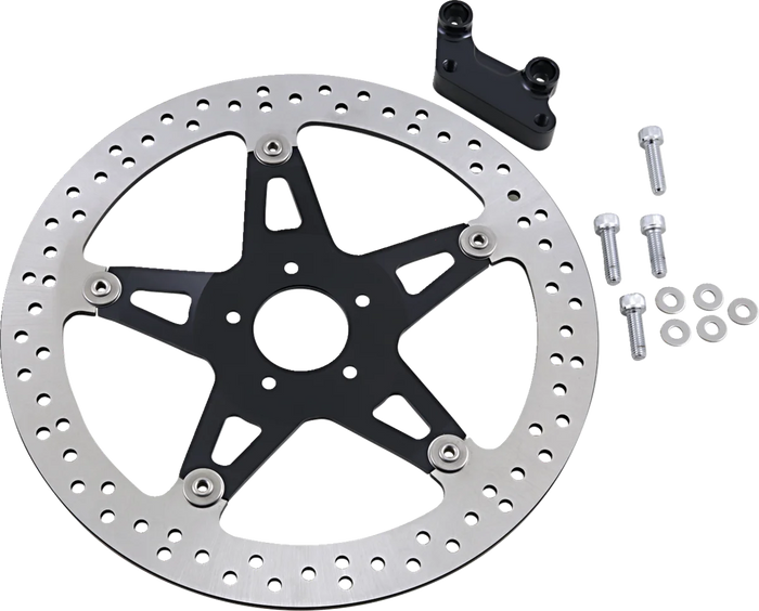 Provides a minimum of 30% more stopping power when compared to factory-sized rotors. Includes oversized floating stainless-steel rotor and billet brake caliper adapter and necessary hardware. Utilizes factory brake caliper, brake line and wheel. Easy Installation with no need to re-bleed the brake system. Designed to work with factory fork legs..