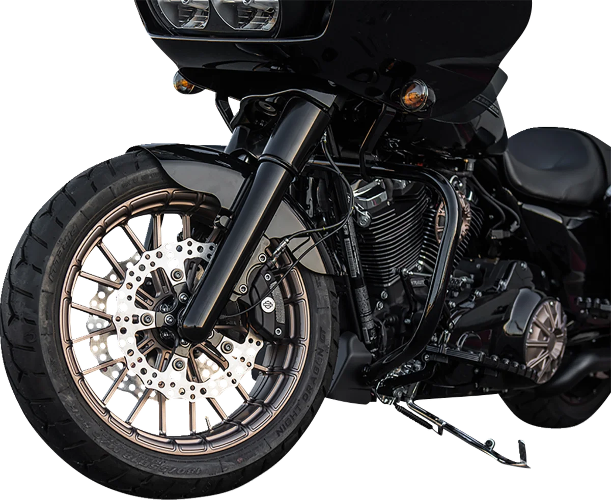 Features notched inside surfaces to allow direct bolt-on fitment of 18” x 5.5” wide/fat front fenders and wheel kits on touring models. Universal design accepts all aftermarket fat/wide front fender kits. Fork boots will work with factory and aftermarket fork legs. CNC-machined from billet aluminum. Check clearances when installing with fat front wheel/fender applications..