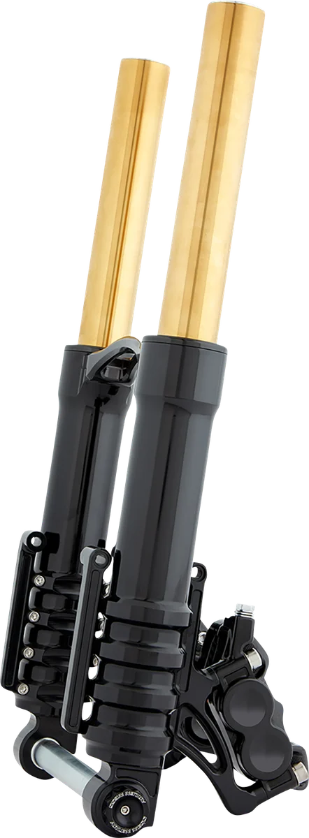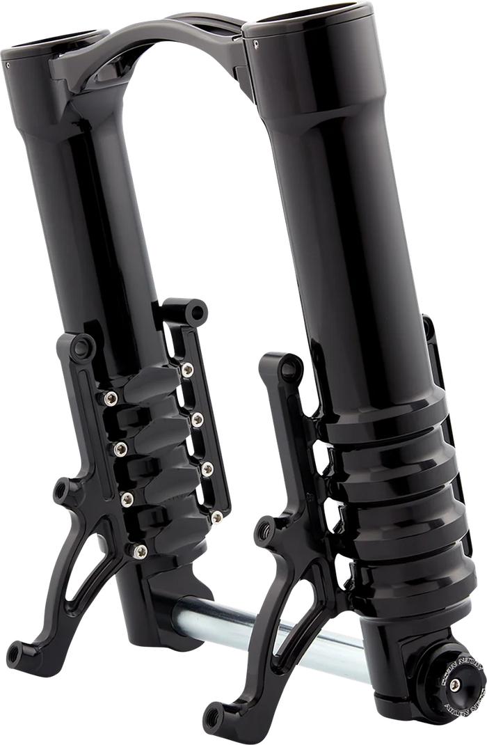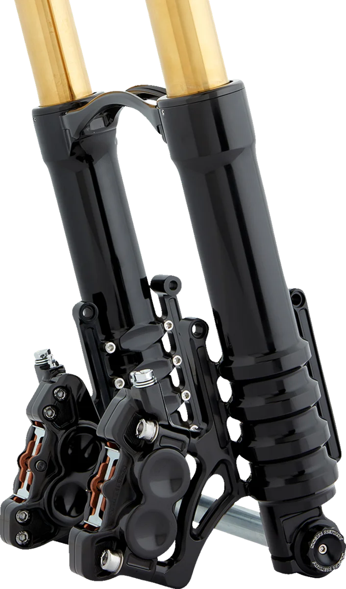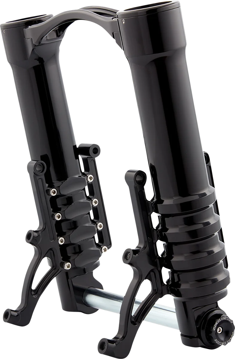 Racing inspired design with integrated performance features that help elevate the style and handling of touring models. Integrated "No Flex" fork brace flows seamlessly with the lines of the fork legs while adding stability and rigidity to the front end. 12-point style axle nuts with laser logo. Dual disc design. Designed for use with 11.8" brake rotors. Accepts factory brake calipers or custom radial mount brake calipers. Radial caliper legs include 100 mm caliper brackets. Designed for 18" and 19" front wheels (21" front wheels may require spacers for fork brace). Includes a set of fork seals, billet dust seal covers and steel axle.