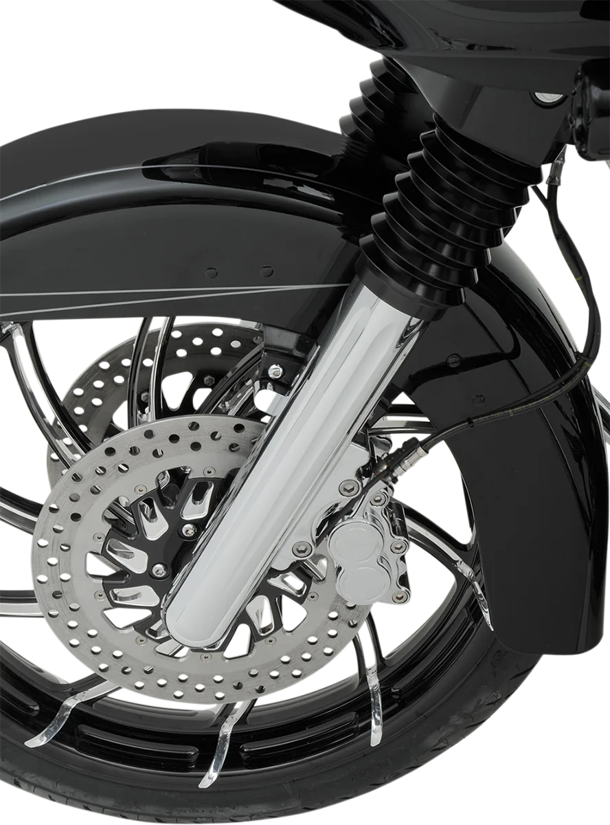CNC machined from billet aluminum. Features a tapered design with hidden axle. Dual-disc for touring applications. Accepts factory or aftermarket suspension internals.