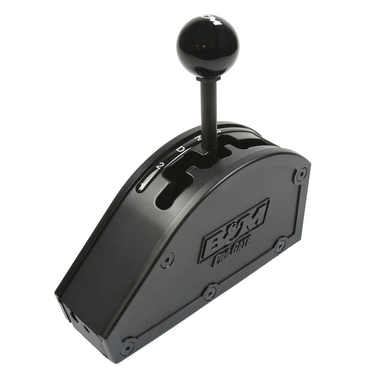 Description_MKT | The B&M Pro Gate shifter is an externally gated race shifter for GM 3-speed automatic transmissions. The compact and lightweight design features a 10-gauge black oxide coated 304 stainless steel base with a heavy-duty 303 stainless steel shift pin for longevity and bullet-proof performance. The 1016 steel shift stick includes a black B&M logo shift knob for shifting duties while the external gate plate is constructed from black oxide coated 11-gauge 304 stainless steel for durability. The 3-speed gated forward shift pattern features a staggered shift pattern with positive stops between each gear for easy and precise shifts. Other features include thick injection-molded nylon side covers featuring a knurled texture with the B&M Pro Gate logo on both sides. The covers are removable for access to the virtually maintenance-free shifter sub-assembly and will not gum up with dirt affecting shift performance, which is ideal for Off-Road racing. The rear exit cable design includes a black 5-ft Super Duty race shifter cable along with a cable bracket, shift lever, and all necessary hardware for a straightforward installation. Includes Lifetime Limited Warranty. |