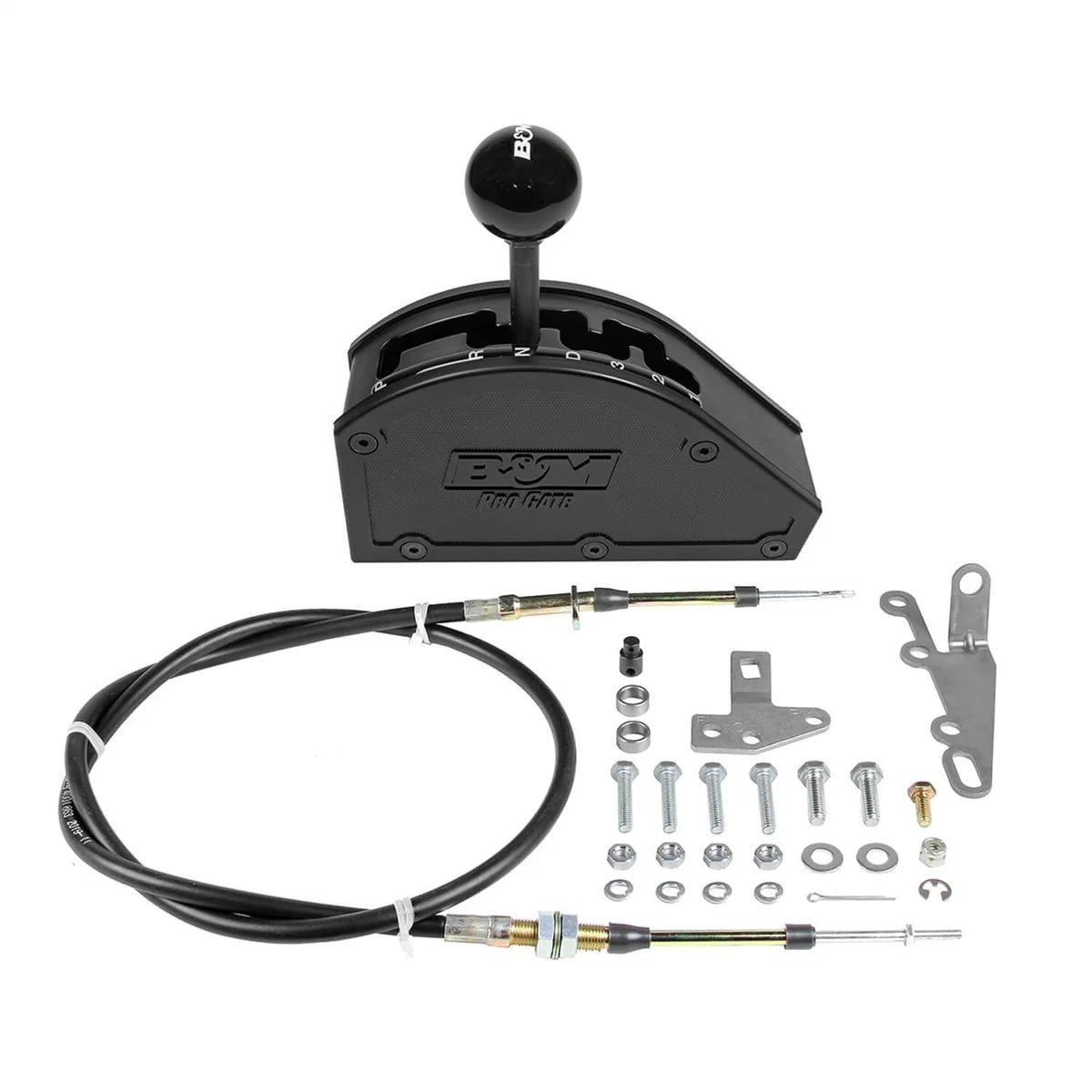 Description_MKT | The B&M Pro Gate shifter is an externally gated race shifter for GM 4-speed automatic transmissions. The compact and lightweight design features a 10-gauge black oxide-coated 304 stainless steel base with a heavy-duty 303 stainless steel shift pin for longevity and bullet-proof performance. The 1018 steel shift stick includes a black B&M logo shift knob for shifting duties while the external gate plate is constructed from black oxide-coated 11-gauge 304 stainless steel for durability. The 4-speed gated forward shift pattern features a staggered shift pattern with positive stops between each gear for easy and precise shifts. Other features include thick injection-molded nylon side covers featuring a knurled texture with the B&M Pro Gate logo on both sides. The covers are removable for access to the virtually maintenance-free shifter sub-assembly and will not gum up with dirt affecting shift performance, which is ideal for Off-Road racing. The rear exit cable design includes a black 5-ft Super Duty race shifter cable along with a cable bracket, shift lever, and all necessary hardware for a straightforward installation. Includes Lifetime Limited Warranty. |