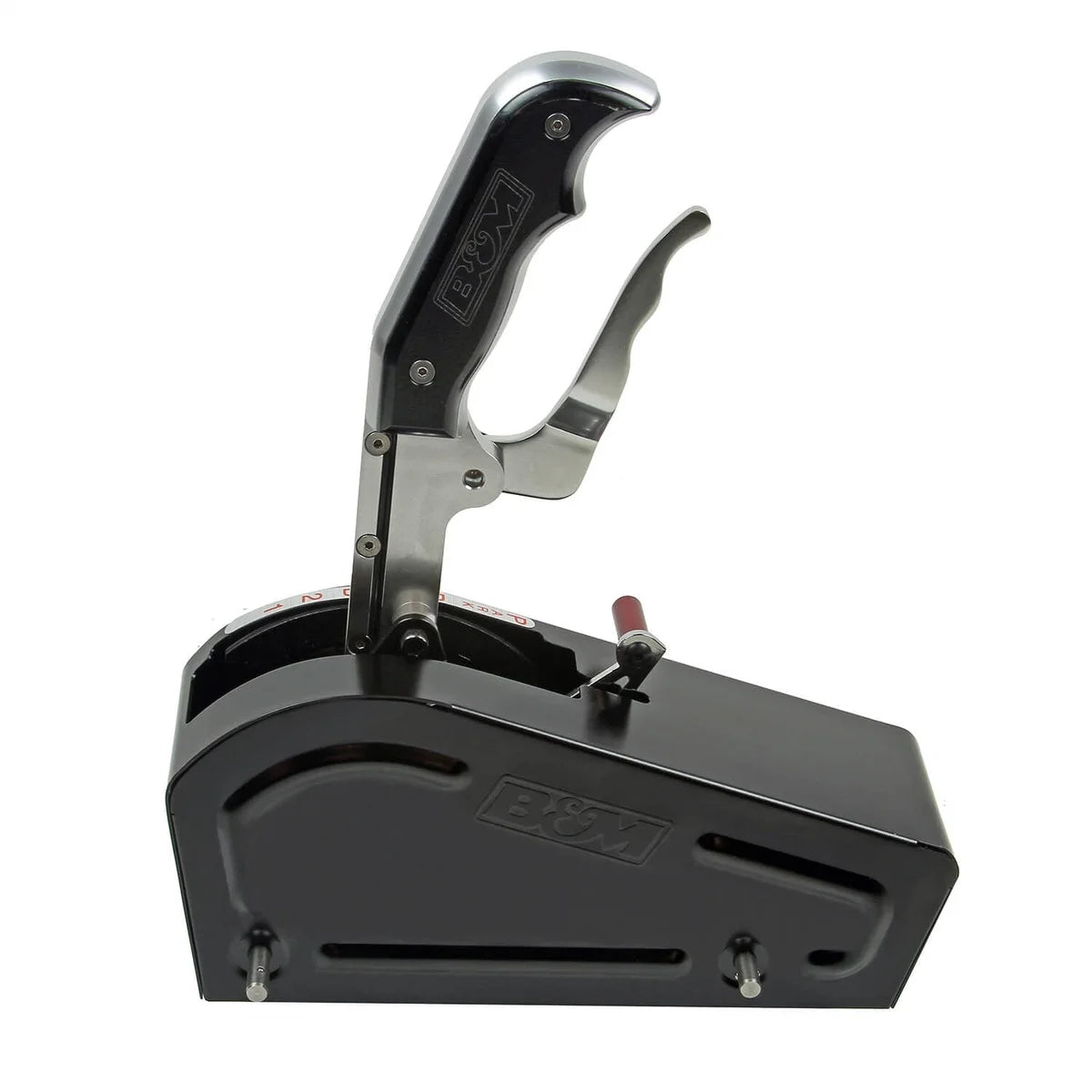Description_MKT | This new Dual Button Two Tone Magnum Grip Pro Stick shifter delivers rock-solid performance, mixed with clean design cues and compact size. This is why you see so many Pro Stick shifters at the race track. We start off with a heavy-duty steel base and hardened steel gate plate. Next is a reverse lockout feature that complies with NHRA/IHRA safety rules and only requires one hand to operate. Now add the billet aluminum Magnum Grip shift handle, replaceable black side grip plates with dual buttons, matching aluminum trigger, and finish it off with a black anodized aluminum cover and quick-release pins. You end up with one good-looking bullet-proof race shifter. Optional Forward and Reverse shift pattern gate plates are available for most popular 2, 3, and 4-speed transmissions. This model Pro Stick comes out of the box ready for most popular 3-speed transmissions and includes a 5-foot Super Duty shift cable, brackets, levers, hardware, and detailed instructions for an easy installation. Applicable Transmissions out of the box: Chrysler (1966+) and AMC (1972+) - A727 / A518 and A904 / A500 Ford - C4 / C5 and C6 GM - Turbo-Hydramatic TH200, TH250, TH350, and TH400 This shifter can be used with the following transmissions with the additional B&M parts shown (sold separately; additional instructions included): Ford - AOD - 40496 (cable bracket & selector lever) Ford - AOD & 4R70W > 40504 (cable bracket & selector lever) Ford - E4OD & 4R100 - 40505 (cable bracket & selector lever) GM - TurboHydramatic (fwd pattern only) - 200-4R & 700R4 / 4L60 - 80712 (4-speed gate plate) GM - electronic, no PRNDL switch (fwd pattern only) - 4L60E, 4L65E, 4L70E, 4L75E, 4L80E & 4L85E - 80712 (4-speed gate plate) GM - electronic, with PRNDL switch (fwd pattern only) - 4L60E, 4L65E, 4L70E, 4L75E, 4L80E & 4L85E - 80712 (4-speed gate plate) 70499 (cable bracket) GM |