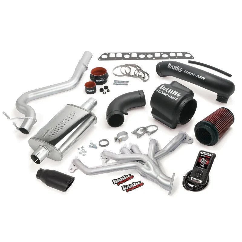 The ultimate engineered power system: adds exhaust manifold to Stinger system, removes more factory restrictions for maximum engine efficiency, power and fuel economy. 4.0L 6-CYL: 1998-06 WRANGLER TJ. PowerPack combines all of Banks' 4.0L Jeep airflow upgrades to maximize power no matter what the terrain. It starts with the free-breathing Banks Ram-Air Intake and high-flow Monster Exhaust, then adds torque-optimizing exhaust manifold (Banks Revolver for 1998-99 models or TorqueTubes for 2003-06). PowerPack unleashes the power your engine wastes trying to overcome factory intake and exhaust airflow restrictions. By improving engine efficiency, more power gets to the rear wheels, your engine lives longer and fuel economy improves. The exhaust note is rich and authoritative, and includes a stainless-steel tailpipe tip in either chrome or black. The included Banks AutoMind programmer comes ready to run with pre-loaded power, with towing, sport, or economy settings right out of the box... and right for the job at hand! Its calibrations were developed with power and increased MPG in mind. The AutoMind can also display a host of critical engine functions and provides service technician diagnostic capabilities with its ability to scan and clear vehicle trouble codes. Gale Banks talks about the exhaust manifolds for 4.0L Jeeps... Banks TorqueTube headers have been the best available power producers for quite a while.About a year ago, I applied my 5 cylinder collector patent to the '91-99 Jeep 4.0L 6-cylinder header using a firing center tube & I Kicked My Own Ass! The NEW Revolver header matches the low end of the previous TorqueTube design & adds a ton of top end power. Have a look at the wheel dyno results. Above 3400 rpm we've added power so your Jeep marches to the shift with no loss in low end torque. Add a complete Banks PowerPack Bundle & get even more! --Gale Banks