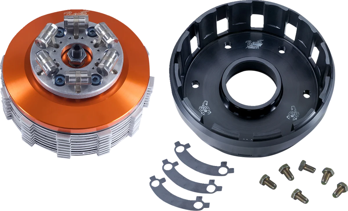 Lock up head, bolt on basket. 100% more surface area. Features an all-new, redesigned billet aluminum lock-up pressure plate designed to fit under the stock primary cover. No need to change or modify your cover. Surface area is greatly increased and lever effort is kept to a minimum. Three different coil spring sets included to provide a wide variety of spring pressure options, allowing you to tune the clutch for stock to 200+ HP applications. Scorpion clutch basket and a steel inner hub is also included to complete the unit. Billet aluminum pressure plate. Adjustable pressure arms increase spring pressure as RPM increase. Can be run wet or dry. Smooth, precise shifting. Made in the USA.