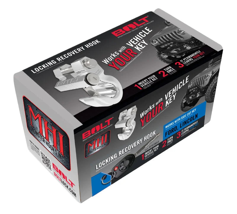 Description_MKT | The BOLT Locking Recovery Hook secures Standard 7/8" Bumper Tabs, Winches and Recovery Ropes and Work With your Vehicle Ignition Key |