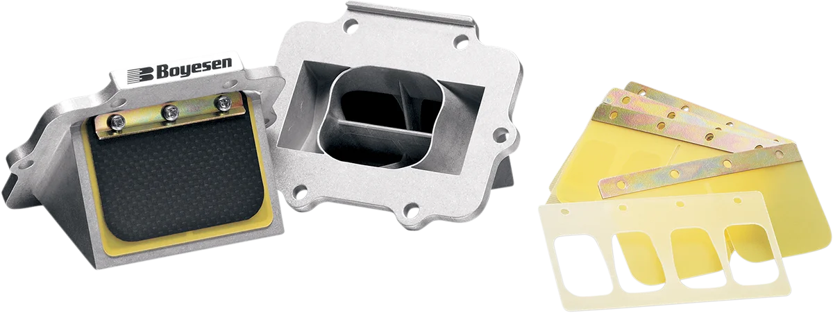 Maintain flow velocity through the valve and redirect intake charge for more even distribution to intake ports. Made of one-piece aluminum castings and bolts in easily; no modifications necessary. Provide quicker, sharper throttle response and more horsepower throughout rpm range. Specially-designed reed cage holds Boyesen's patented dual-stage reeds. Boyesen's hot RAD valve provides plenty of torque.