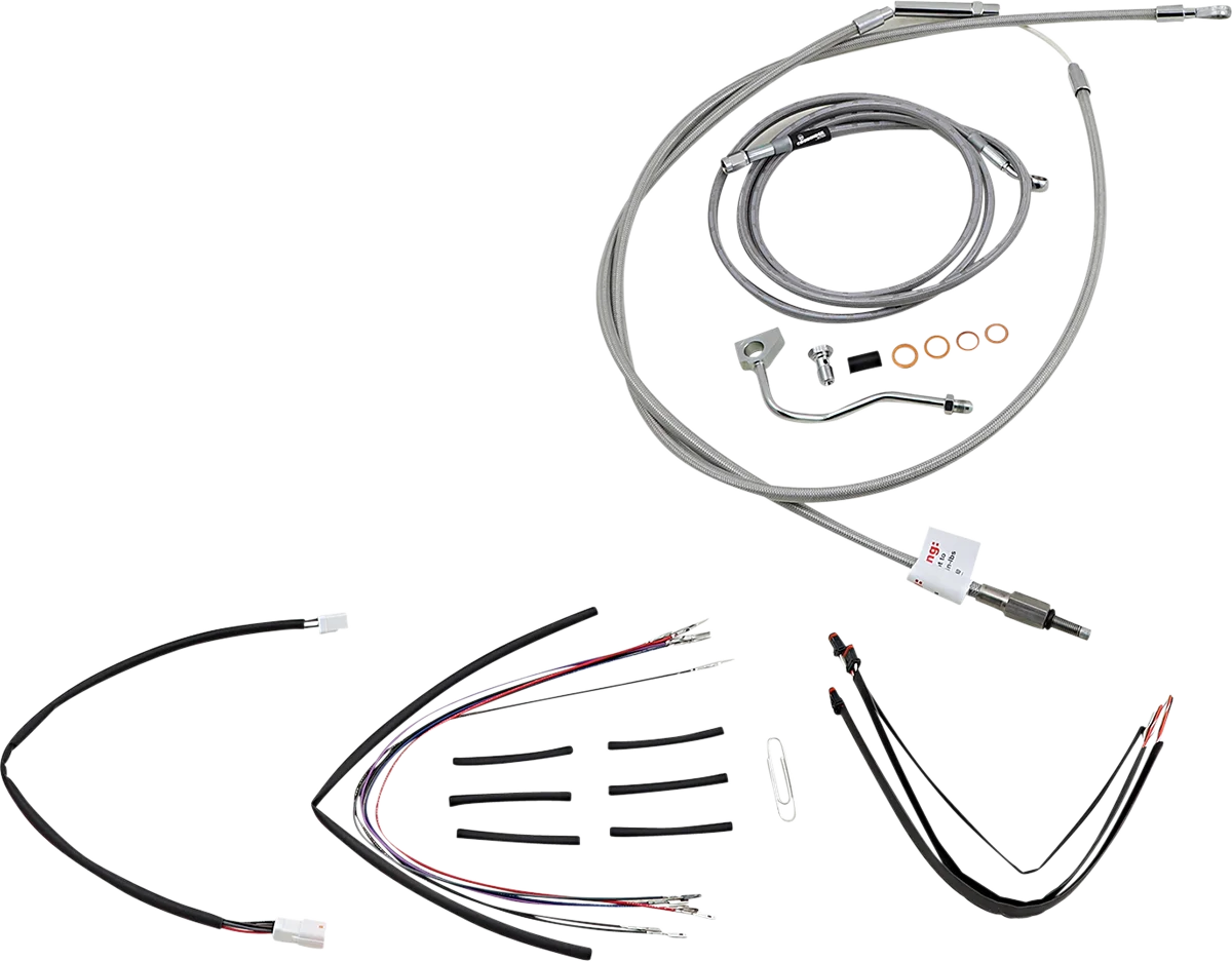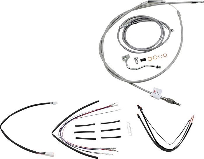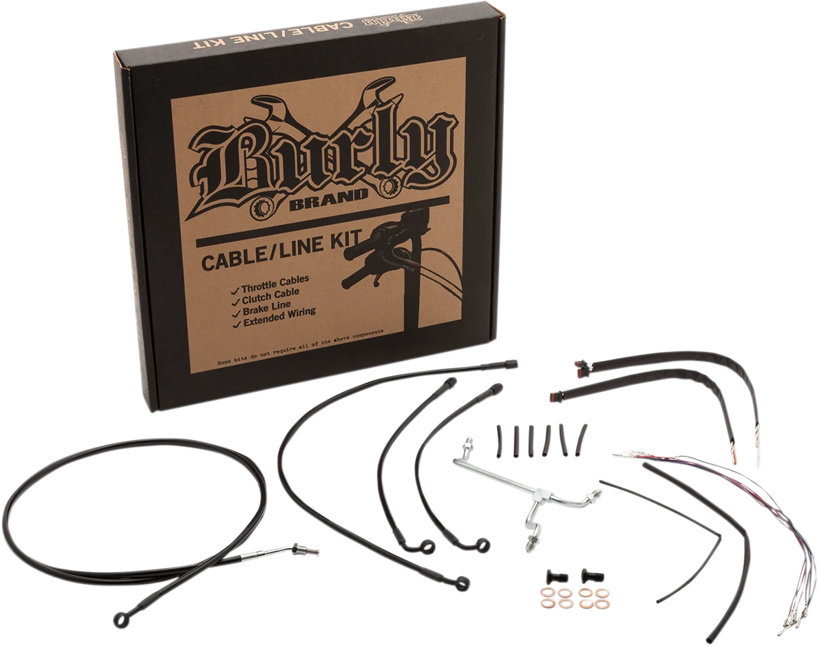 Complete installation kit for Burly Ape hangers. Kit includes extended brake line, extended clutch cable/clutch line, extended throttle/idle cables as required and all necessary wiring. Brake lines feature PTFE inner liner and heavy-duty stainless steel outer braid. Dresser kits reuse stock Throttle-By-Wire harness. Kit is based on using 2" risers with ape hanger-style handlebars..