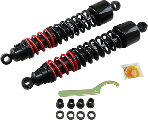 High-performance damper with dual springs. Main spring coil absorbs big hits and prevents bottoming, while the secondary coil smooths out minor road imperfections. Provide a plush ride that's not afraid to play rough. May require modification to exhaust brackets to open up clearance for belt. Before purchasing or installing shocks that are different than OEM length, confirm that wheel travel can be altered without causing clearance issues, such as swingarm/axle to exhaust contact and chain/belt guard or tire contact..
