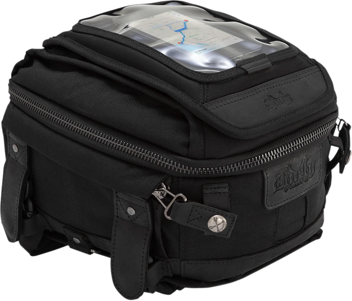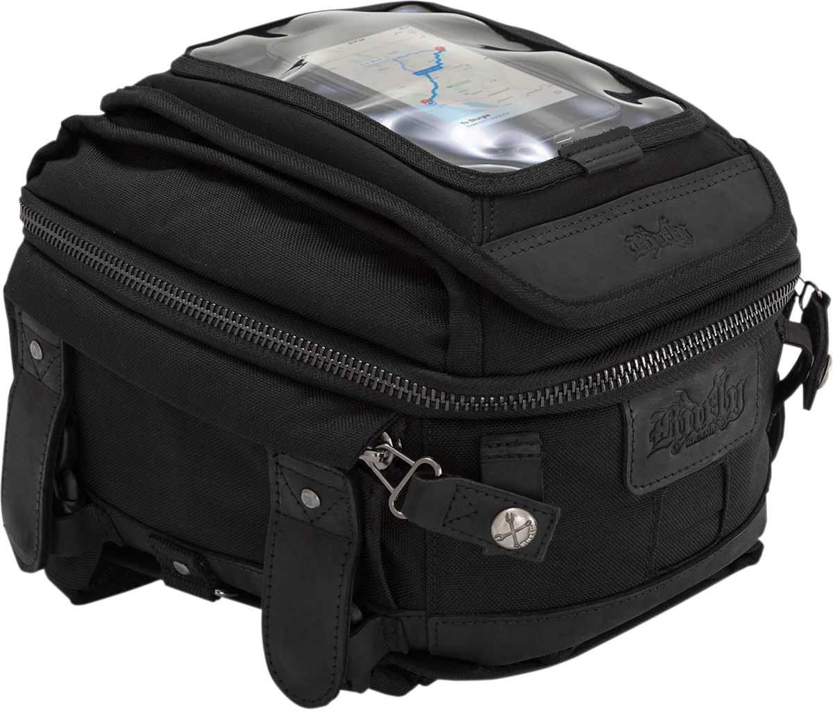Easy on, easy off magnetic system reinforced with safety securing D-ring anchor points for mounting. If you're riding solo or simply want the bag out of the way, it's equally at home on the tail and includes a tail mounting accessory flange that clips and cinches down on the back of your seat. Includes a convenient magnetic removable map/accessory screen that sticks either directly to the bag lid or directly to the tank. The map screen is designed with an innovative stretch screen design to hold any variety of smart phones, small tablets, and even some GPS units. The bag also has a pass-thru port for motorcycle charging accessories so you can keep your smart phone, tablet or go-pro powered up on a long ride. Two exterior zipper pockets with leather securing straps. “Anti-Flail Snap System”. “Moto Centric” speed buckles.