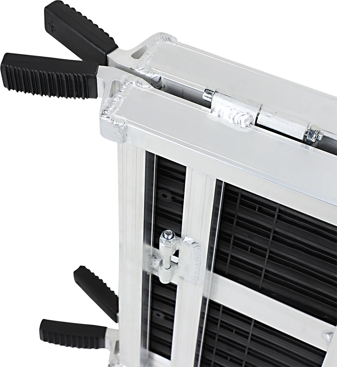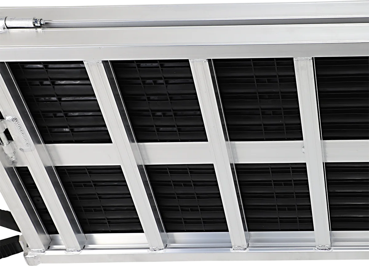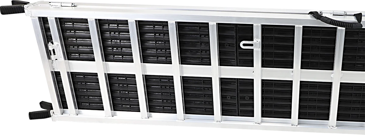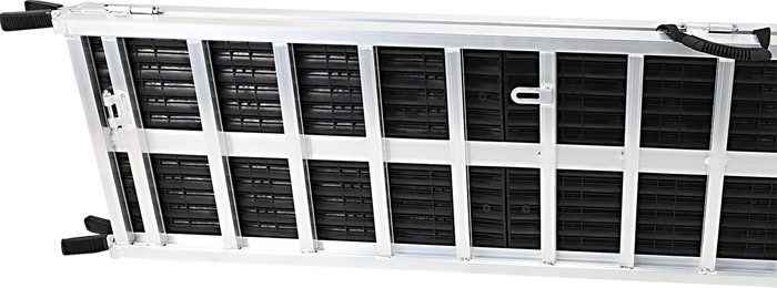 A safe, effective, and efficient loading solution for snowbikes. Accommodates loading with or without all Timbersled wheel kits. Universal hinge system allows ramp to be split, accommodating a wide range of machines. Innovative LowPro grip design provides traction for all types of tires and tracks. Integrated traction feet and fingers ensure a safe and secure surface for ground and tailgates. Ladder folds in half and fits under most ATVs, UTVs, and golf carts.