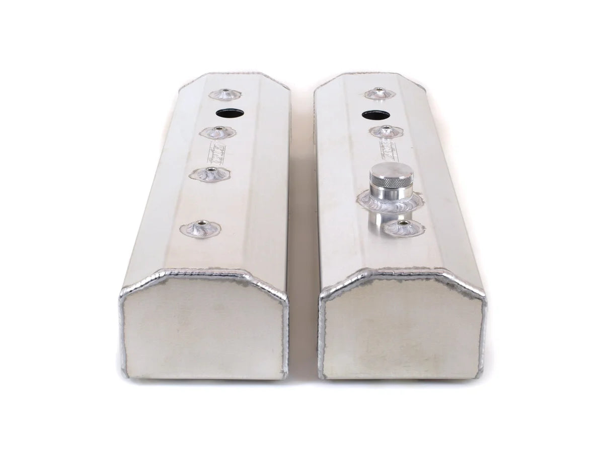 Feature 1 | Tall fabricated aluminum valve covers for small block Chevy come with plc. port holes on each cover and a fill bung with billet cap on the front of one cover |