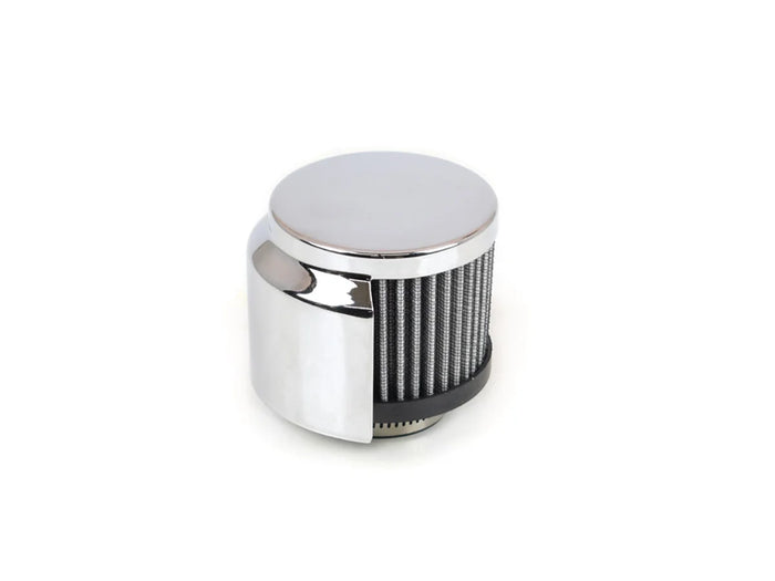 Description_MKT | Universal Hooded breather with 180 degree shield. This Chrome plated valve cover breather is made to work with a 1-3/8" breather tube. The filter element uses a woven cotton fabric enclosed in a wire mesh. The cotton fiber holds oil which traps dirt particles without restricting the air flow. Washable for long life. One to a package. |