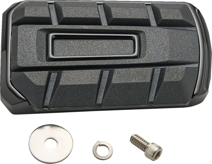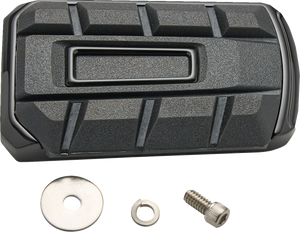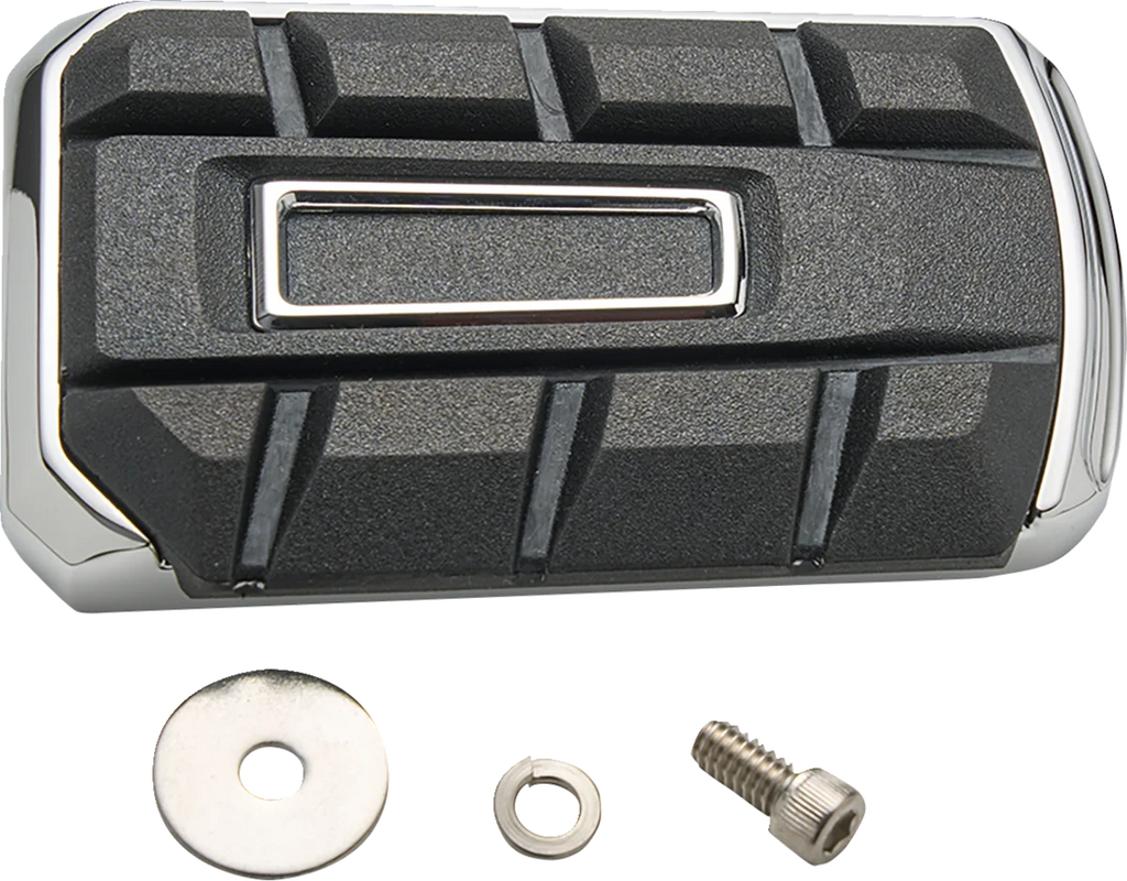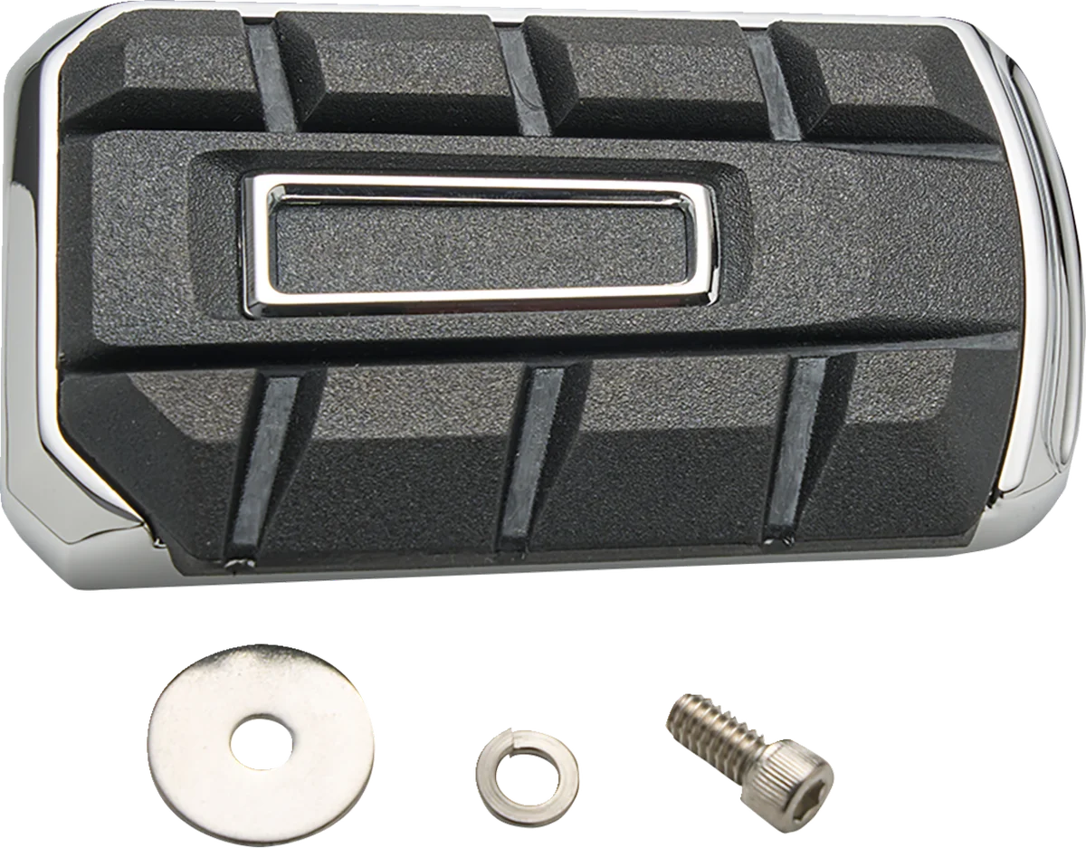 Metal and rubber pad adds style and function with a slightly larger surface than the stock pad. Easy installation. Aluminum construction with stainless steel hardware and EPDM rubber.