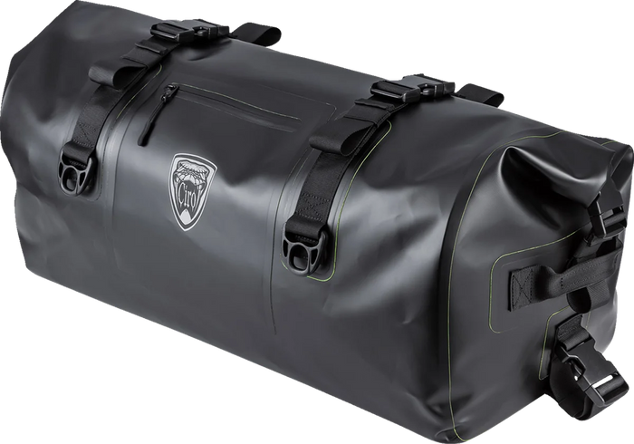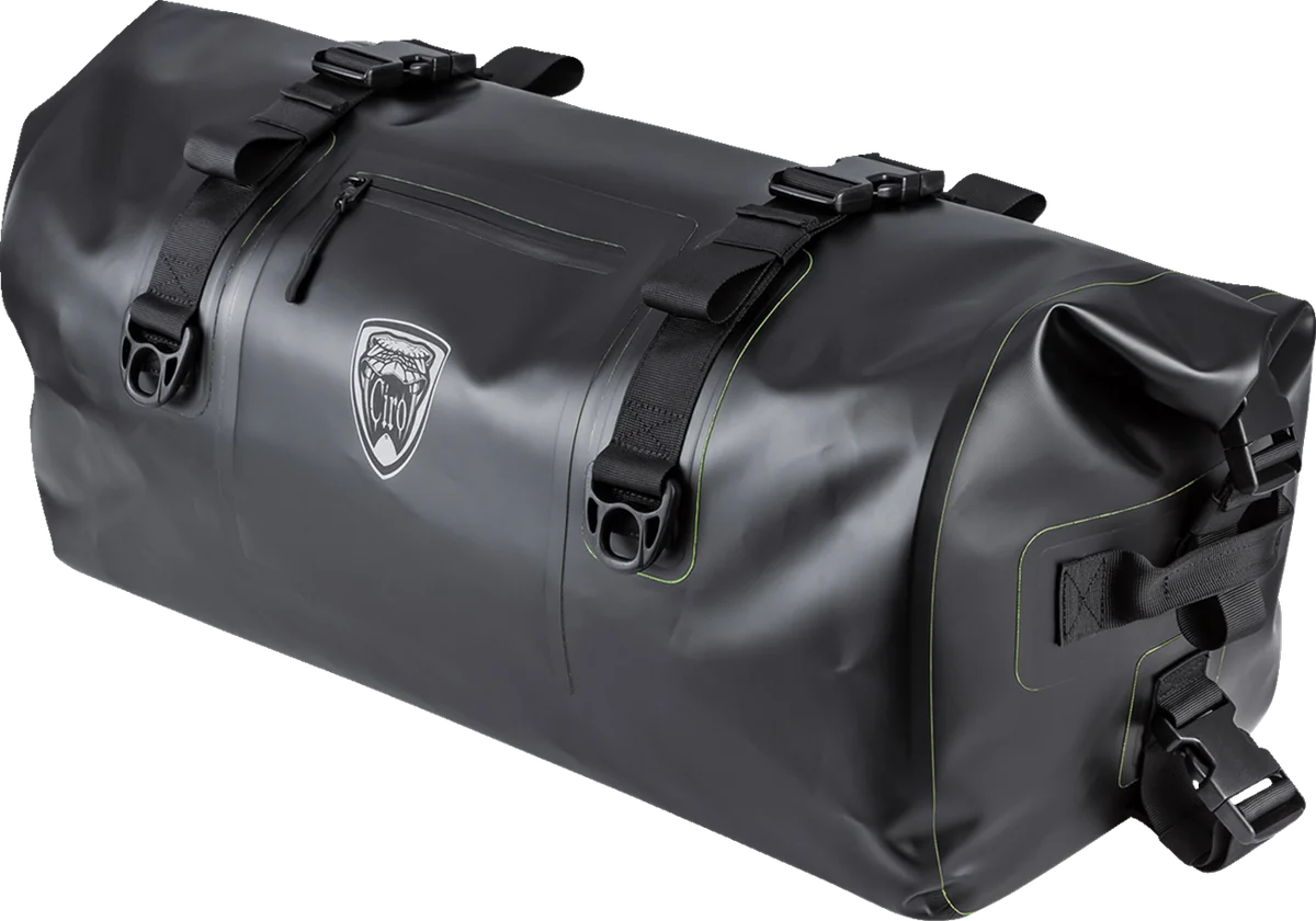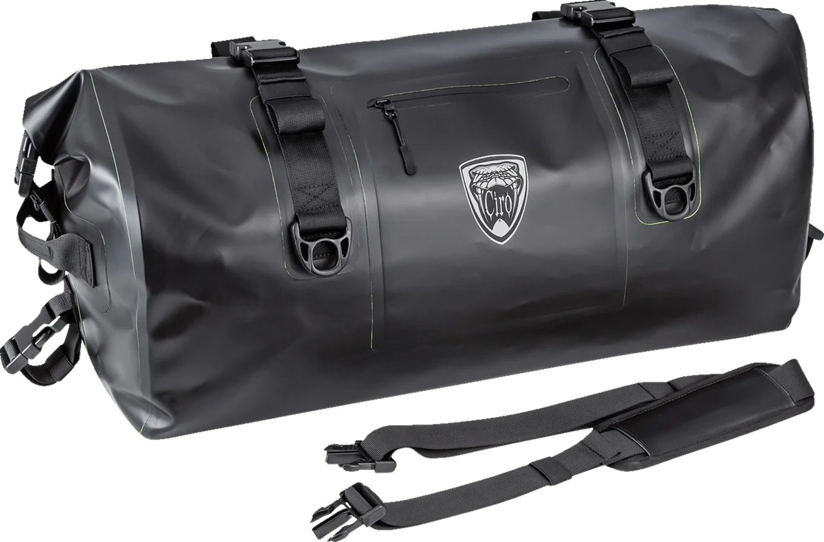 Collapsible. Quick release shoulder strap doubles as tie down strap. Adjustable loops for quick mounting. Custom 840d nylon TPU laminate with welding seams. 4 Heavy-duty nylon attachment points. Front and back pockets. YKK zippers. High strength hook & loop roll top closure. Oversized handles. Reflective Ciro logo.