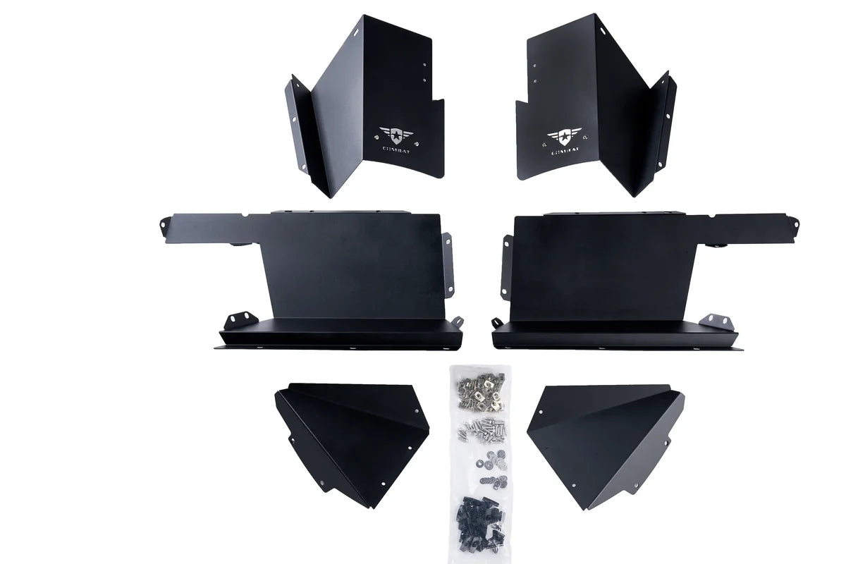 | Description_MKT | Fitting the 2020+ Jeep JT Gladiator, our Battle Ready Inner Fenders will protect your engine bay from rocks and debris while releasing the heat that builds up during those slow-moving trail rides in the hot summer. The high UV load black powder-coated aluminum construction will hold up under even the toughest conditions while maintaining proper airflow through the mesh inserts. Made from laser-cut, 6063 aluminum with stainless steel hardware, the Battle Ready Inner Fenders are easy to install and include a removable, customizable backing plate. This product is covered by the Combat Lifetime Guarantee. |
