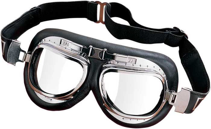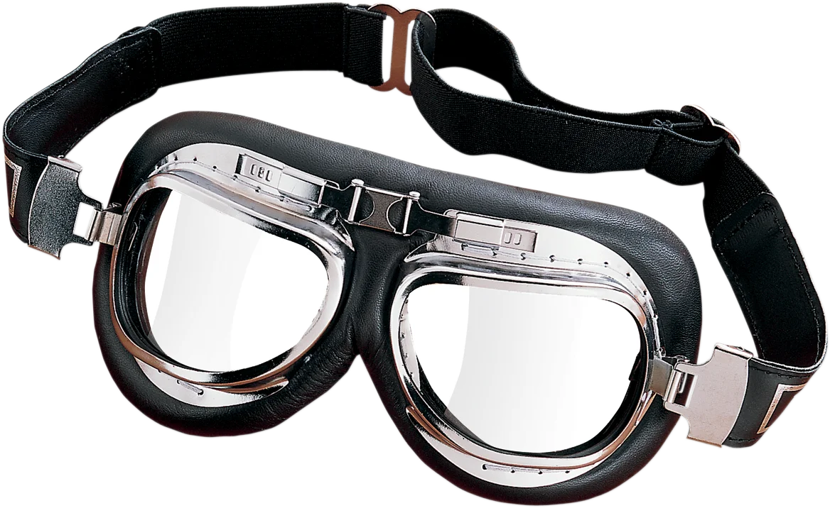 These goggles, offered with chromed metal frames, feature clear acrylic lenses. Feature genuine leather padding with suede face cushion for a secure, comfortable fit. Three-position lens adjuster, air vents to reduce lens fogging and an adjustable elastic headband make these goggles a real winner.
