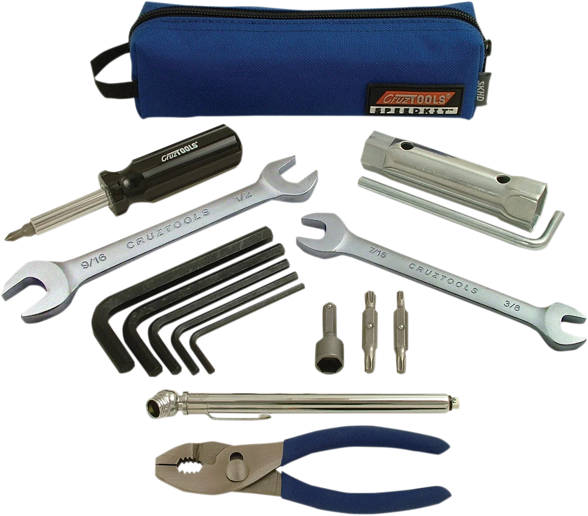 Ultra-compact tool kit packed with functionality for Harley Davidson motorcycles. A major upgrade over OEM tool kits, and still fits in a relatively compact space. Kit Includes. 14x17 mm open end wrench. 12 mm combination wrench. 10 mm combination wrench. 8 mm nut driver. 5/18" & 18 mm combo spark plug wrench with lever. Mini 5-in-1 screwdriver with Torx T20, 25, 27, 30 bits. Hex keys: 3, 4, 5, 6 mm. 0-20 psi tire gauge. Locking pliers. Heavy-duty zip-up pouch. Lifetime guarantee - no questions asked. Made in the U.S.A.. Dimensions approximately 7" x 2" x 2".