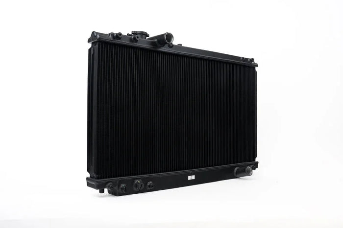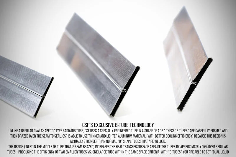 CSF has over 5 decades of experience manufacturing radiators. So when it comes to keeping your engine cool and your MK4 Supra running at its best, a CSF High-Performance All-Aluminum Radiator is the obvious choice. Designed to perform on the street or at the track, a performance radiator is a must-have for both high horsepower builds as well as race vehicles which need added cooling performance in motorsports environments. This radiator features a 2-Row core with CSF's exclusive B-Tube Technology: Unlike a regular oval shape "O" type radiator tube, CSF uses a specially engineered tube in the shape of a "B". These "B-tubes" are carefully formed and then brazed over the seam to seal. CSF is able to use thinner and lighter aluminum material (with better cooling efficiency) because this design is actually stronger than normal "O" shape tubes that are welded. The design (inlet in the middle of the tube that is seam brazed) increases the heat transfer surface area of the tubes by approximately 15% over regular tubes - producing the efficiency of two smaller tubes vs. one large tube within the same space criteria. With "B-tubes" you are able to get "dual liquid laminar flow". CSF also uses ultra efficient multi louvered fins that are carefully and precisely aligned to maximize airflow through each radiator core. Fin specifications are carefully measured and calculated for each application, and tested for maximum heat rejection efficiency in our wind-tunnel lab.