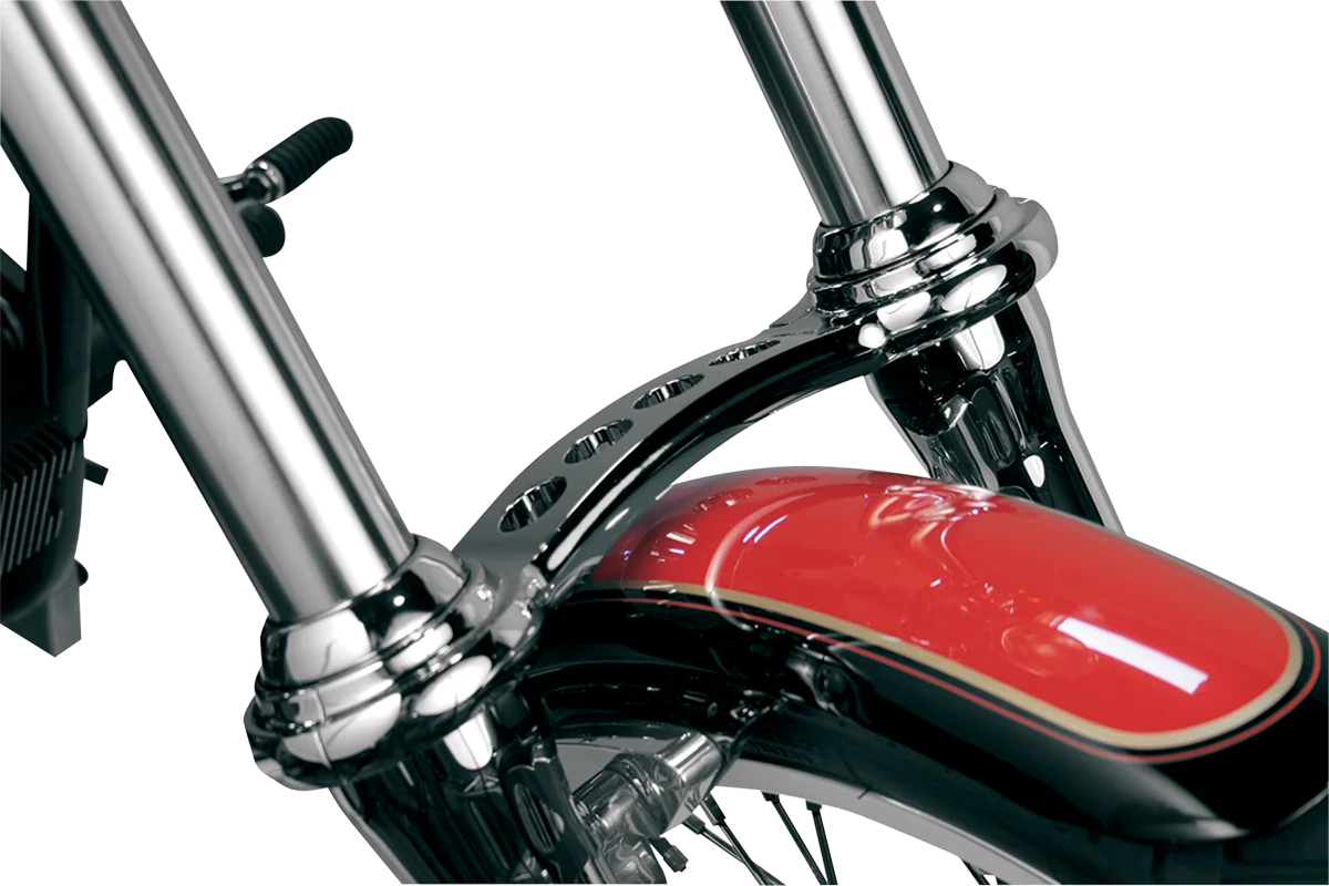 Original Randy Smith design. Manufactured from a solid piece of 6061 T-6 aluminum, then chrome-plated. Designed with a compound arch for greater torsional stiffness, which means not only less deflection and twisting but more fender clearance. Bolts to lower fork legs, which enables the use of dust covers; no need to disassemble the front fork. Made in the U.S.A. by Custom Cycle Engineering.