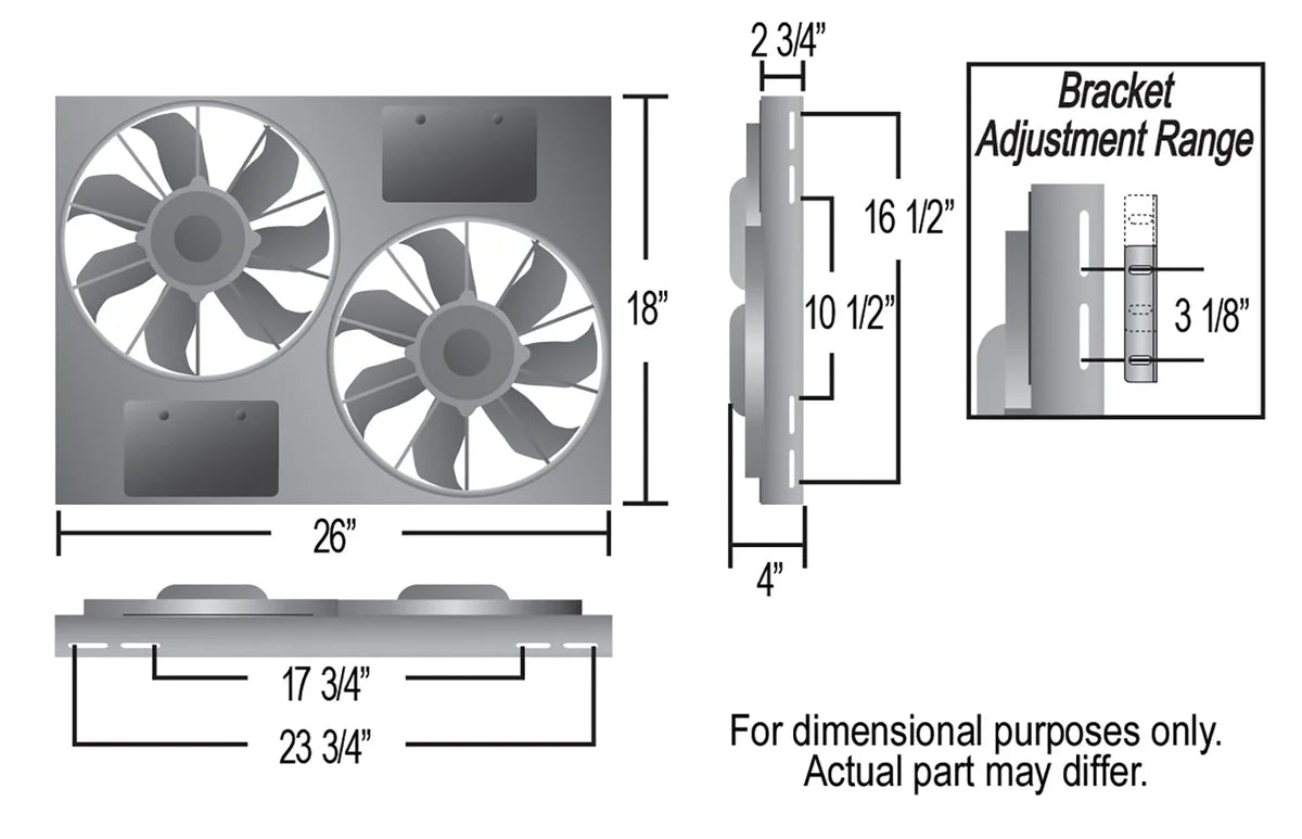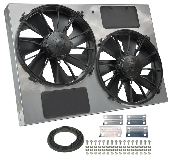 Description_MKT | This high performance primary cooling fan Powerpack kit combines two high output motors and a sturdy laser-cut powder coated metal shroud with pressure relief vents to produce one serious dual electric fan setup. Shroud measures 26" wide by 18" top to bottom and is only 4" in overall depth to offer an adjustable yet precision fit. Designed for puller applications, It's perfect for muscle cars, street rods and heavy duty trucks, this combination produces 4,000 CFM while each fan draws 24.8 amps. Includes mounting brackets, hardware and two high amp relay harnesses. |