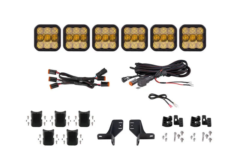 Features Bolt-on fitment compatible with Ford Bronco 2021 Ultra-high intensity, with custom-engineered TIR optics Selectable backlight color, with eight color options Torture-tested, heavy-duty construction Control through factory aux switch bank using the included harness Assembled in USA Overview Perfect Fitment. The Grille CrossLink Lightbar Kit compatible with Ford Bronco 2021 from Diode Dynamics allows you to mount six linked SS5 LED pods on the factory grille. These application-specific brackets were CAD-designed to bolt into place using factory mounting points on the grille. No cutting or drilling required! Designed for Performance. Featuring the highest output intensity of any 5-inch LED pod on the market, these lamps have been designed for maximum functionality, with patented technology and custom-engineered TIR optics, all in a durable package. Selectable Backlight. The Stage Series 5inch LED Pods included in the White kit feature a selectable backlight with eight different color options, perfect for an extra styling accent, or for more visibility when you’re not using the main beam. Selecting your backlight color is easy - simply alternate the power on and off. There’s no complicated programming with a controller! The SS5's backlight fully illuminates the TIR optic, providing unique accent lighting that you won't find on other LED pods. NOTE: Due to the yellow lens, the Yellow kit is only available with an Amber backlight color. CrossLink. Our patent-pending CrossLink technology allows you to link up to eight SS5 pods together to create your own lightbar. The single-piece CNC aluminum link provides extreme rigidity, but is fully adjustable, for both straight and curved configurations.