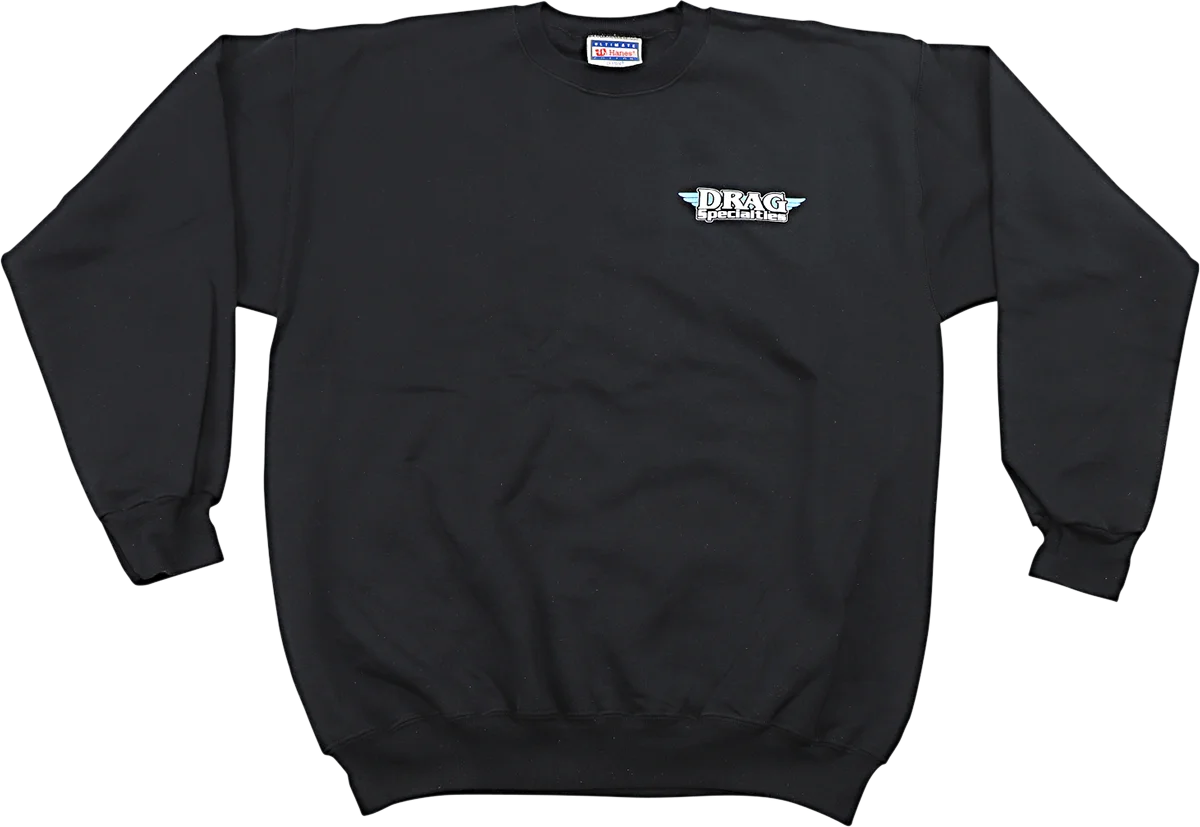 Top-quality black sweatshirt is made from a 50/50 cotton/polyester blend. Crewneck sweatshirt features the Drag Specialties wing logo on the upper-left front and on the back.