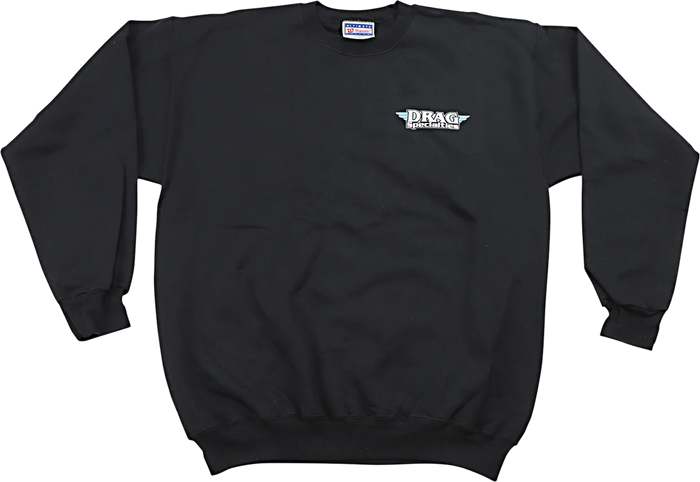 Top-quality black sweatshirt is made from a 50/50 cotton/polyester blend. Crewneck sweatshirt features the Drag Specialties wing logo on the upper-left front and on the back.