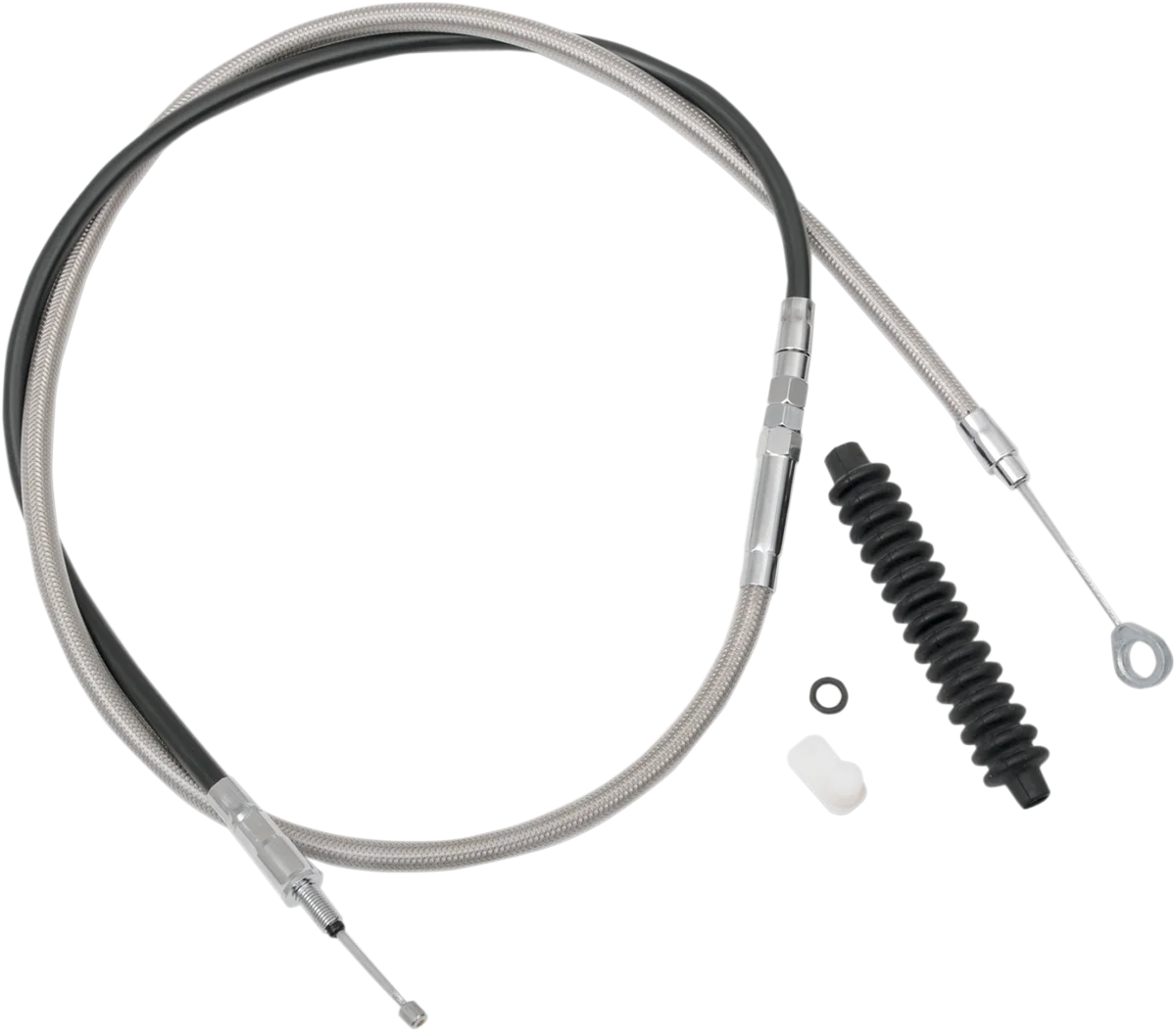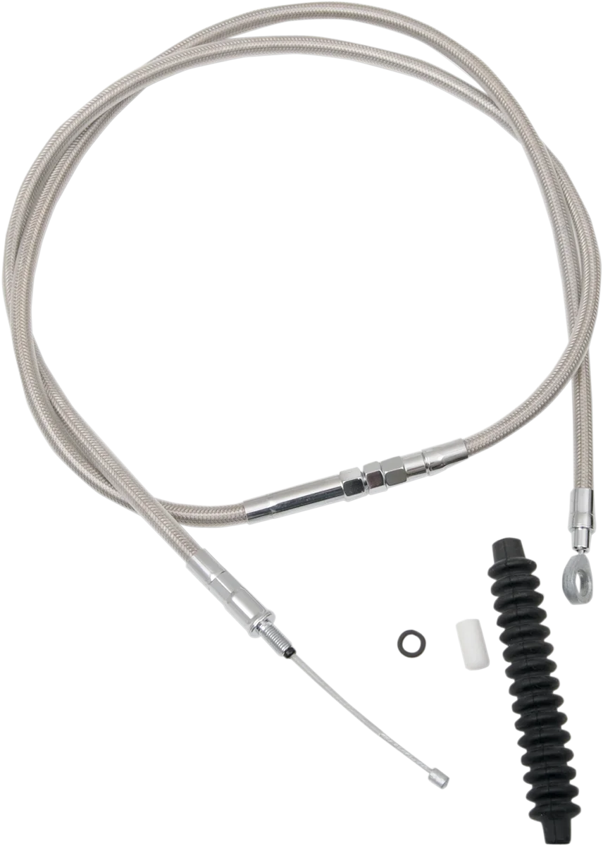 Low effort, maximum efficiency cable design meets or exceeds all OEM specifications for fitment, construction and endurance requirements. Cables feature chrome-plated fittings, stainless-steel braided outer casings, tempered-steel inner wire and a nylon inner sleeve for smooth operation. Braiding is coated with a non-yellowing clear coating for abrasion resistance. High-performance cables use the latest technology of longitudinally winding the outer housing lengthwise rather than spirally so cable bends in a more natural arc and eliminates spring and compression. Late-style cables are measured with the adjuster completely collapsed.. Adjuster measured from bottom of cable..