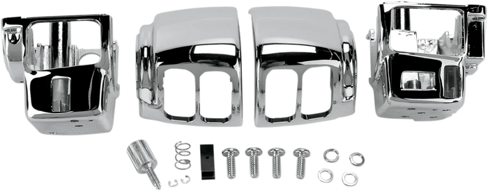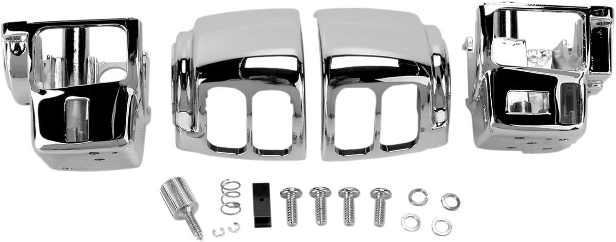 Feature chrome brake and clutch controls. Die-cast aluminum switch housings have radiused edges, OEM-style clamps, smooth tops and a chrome finish for a clean look. Accepts OEM style switches and wiring. Master cylinder accepts OEM-style rebuild kits and have clearance for all 1-1/4" handlebars.. Switches available separately.. Brake/clutch controls and switch housings with OEM style clamps sold separately.. Chrome switch clamps available separately..