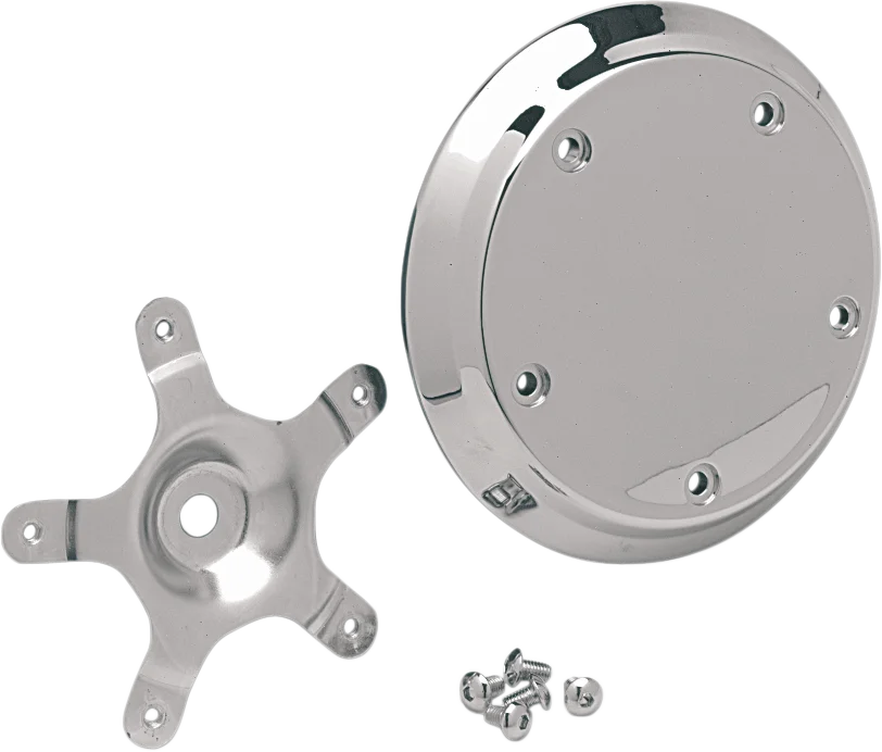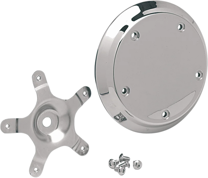 Matches the five-bolt style of OEM derby cover. Die-cast insert with a chrome finish.