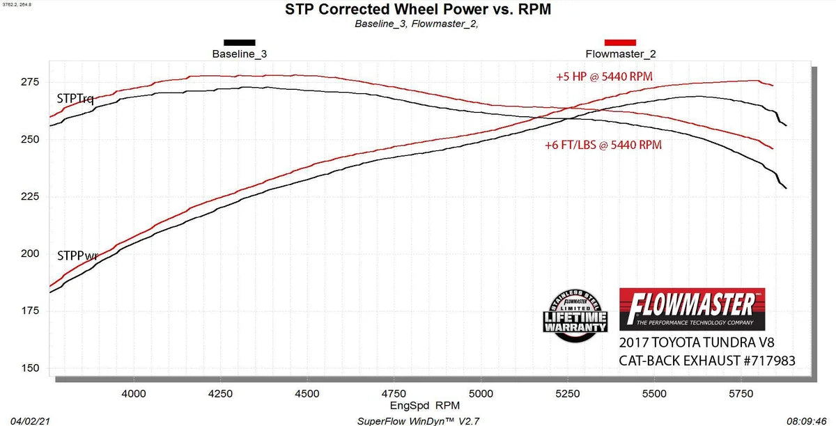 Description_MKT | Flowmaster introduces our Flow FX Extreme stainless steel cat-back exhaust system for the 2007-2021 Toyota Tundra with the 4.7 or 5.7-liter engine. This system uses a Flow FX series muffler for an aggressive to moderate sound level and increased performance. 3.00-inch mandrel bent 409 stainless steel tubing allows for maximum exhaust flow and durability. The system has a turndown style, dump exit right after the muffler to eliminate the over-axle tailpipe. This elimination of the tailpipe helps improve ground clearance and departure angle when you are driving in more extreme off-road situations. This system produced max dyno gains of 5 hp and 6 lb-ft of torque at the rear wheels. All of the necessary hardware is included, and factory-mounting locations are used for an easy installation. Backed by Flowmaster's Lifetime Limited Warranty |