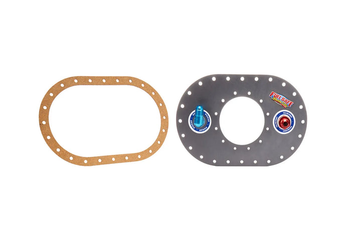 Fuel Cell Filler Plate - 4-3/4 in 12-Bolt Fill Tube Bolt Circle - 6 x 10 in Oval 24-Bolt Flange - 8 AN Male Outlet / Vent - Aluminum - Black Anodized - Each