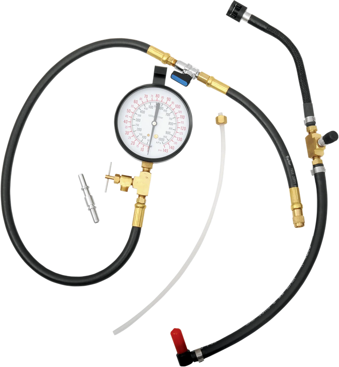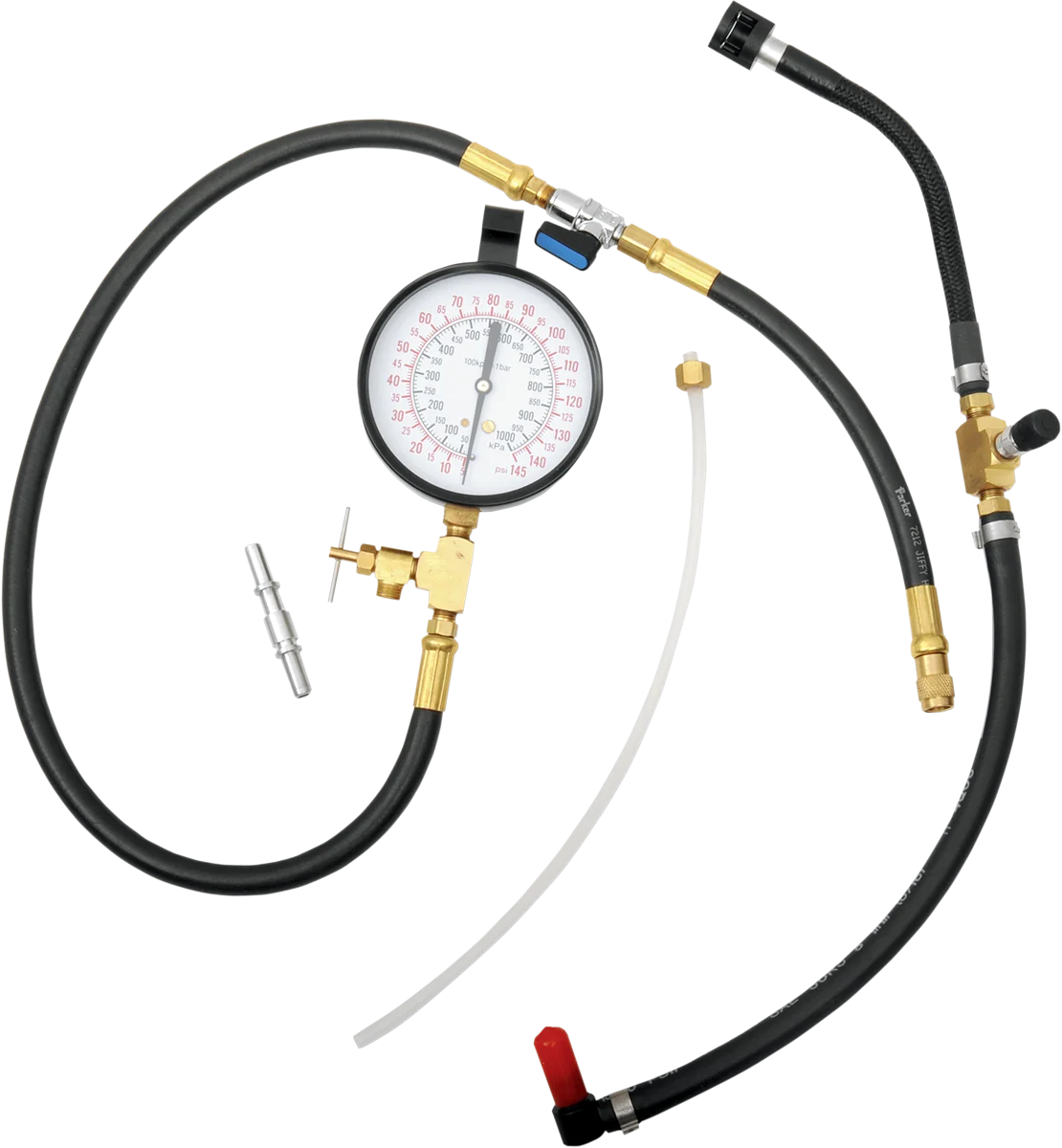 Includes all necessary parts to diagnose Delphi fuel injection; a large gauge assembly, 8" hose, 2" hose, fuel tank connection hose, throttle body connection hose, overflow hose, tee fitting, valve assembly, ball valve, needle valve, 08-09 depth adapter, 1/4" tube sleeve, #243 locktite, tool case, and instruction sheet. Accurately diagnose causes of stalling, poor fuel economy, loss of power, hesitation, fuel pump-related problems inside the tank and more. Fuel pressure test can be easily performed in about the time it takes to change a set of spark plugs. Can be installed in line with the motorcycle's fuel supply system. Can be used for road tests and during Dyno diagnostics/tuning. Necessary diagnostic tool for all Delphi injected models. Made in the U.S.A..