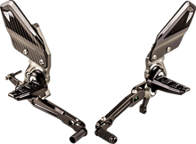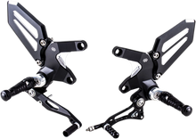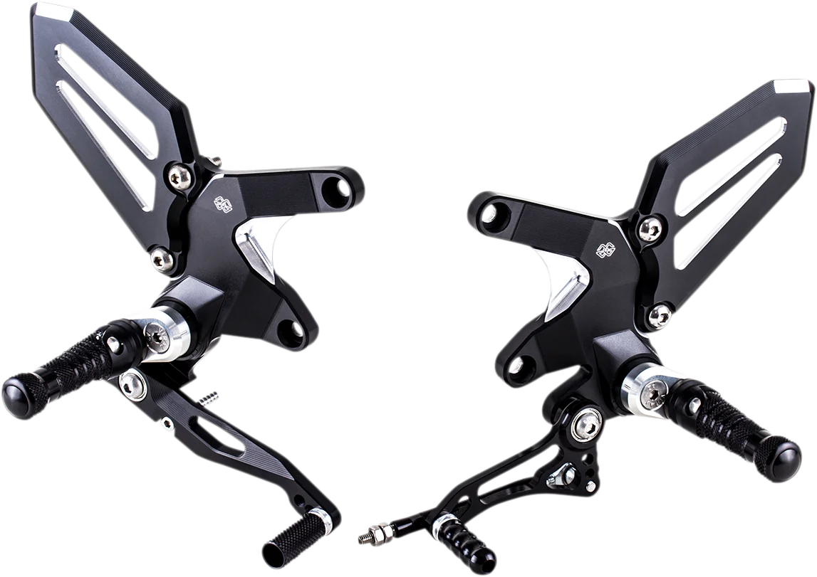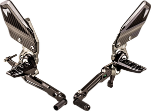 Different footpeg positions possible through adjustment. Comfortable yet sporty positions available. Adjustable toe pieces on brake and gear lever. Heel guards included. CNC machined for reduced weight. Equipped with foldable footpegs.