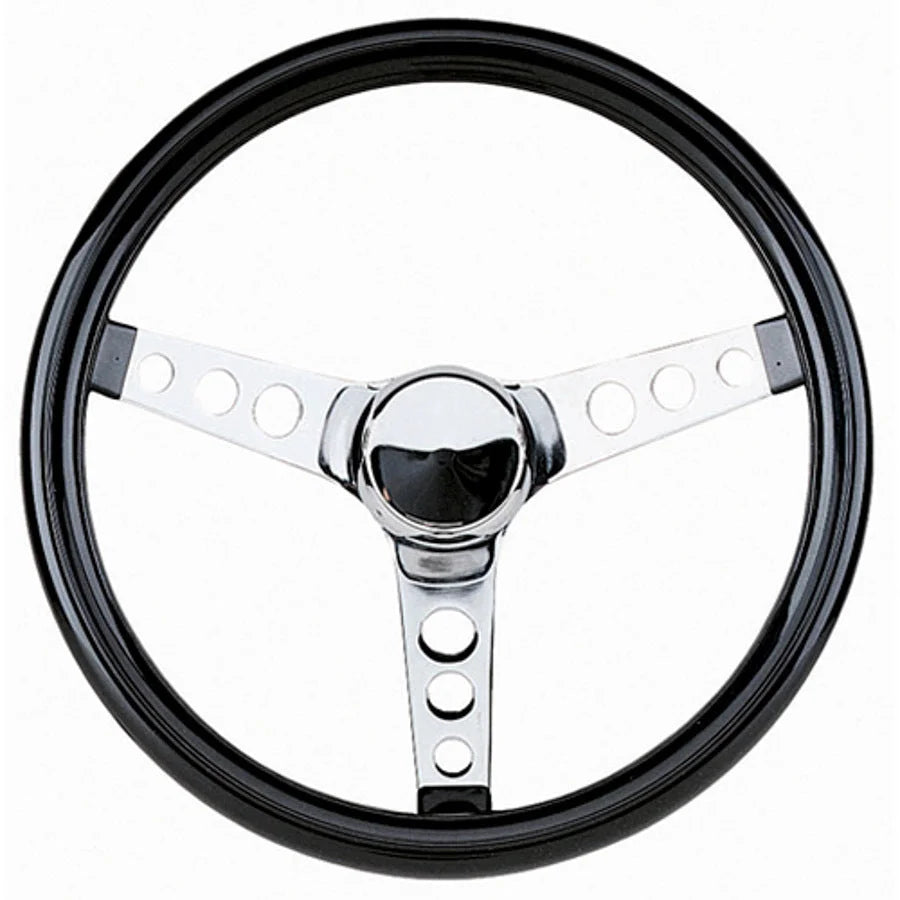 Steering Wheel - Classic Crusin - 12.5 in Diameter - 3 in Dish - 3-Spoke - Black Vinyl Grip - Steel - Chrome - Each