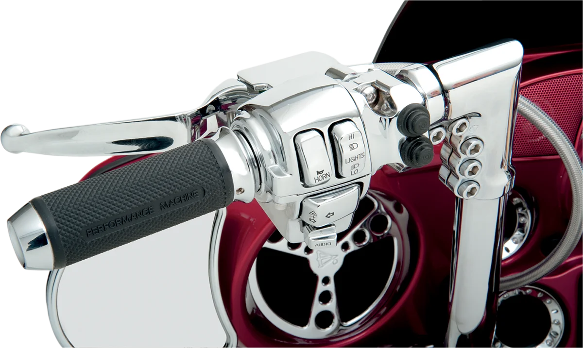 Chrome switch housings available separately. Master cylinders accept OEM-style rebuild kits and have clearance for all 1-1/4" handlebars. Models with dealer-installed cruise control may require different or additional lower switch housings; upper and lower switch housing are not compatible with OEM housings..