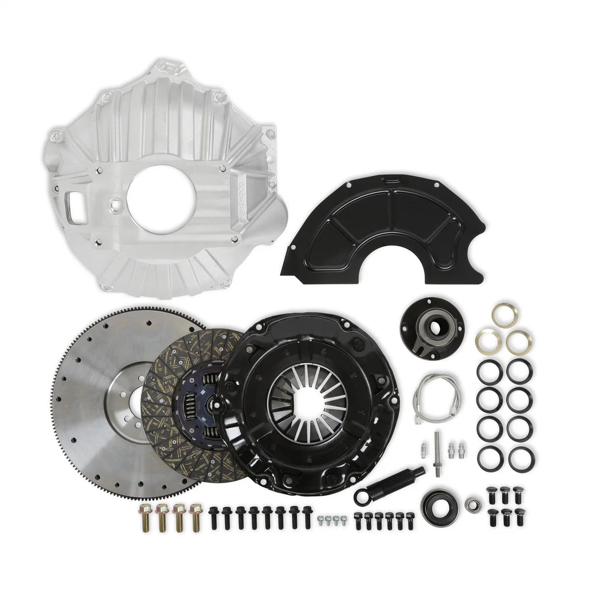 | Description_MKT | These Holley Transmission Installation Kits come complete with everything you need to bolt a TKX or TKO transmission to a 1955-1985 small or big-block Chevrolet engine. Built with a mixture of our best brands including Lakewood, Hays and Mr. Gasket. Kit includes: A roller pilot bearing, bellhousing with dust shield, billet steel flywheel, clutch and pressure plate, hydraulic release bearing, and all hardware needed to install these components. |