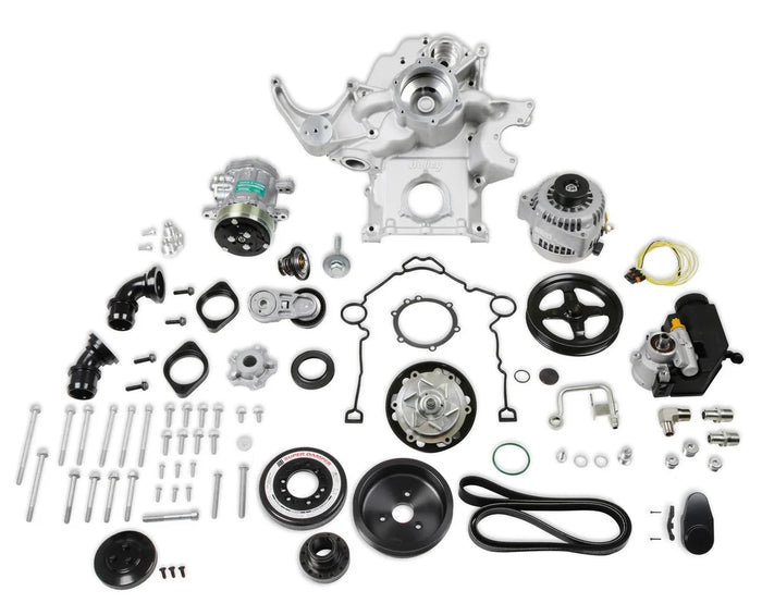 | Description_MKT | Holley's complete, mid-mount accessory system has all accessories pulled in tighter than other accessory drives. At the heart of the system is a "bracketless" design (patent pending), where the accessories bolt directly to the timing cover for a clean, integrated system. The design offers superb engine visibility to show off your horsepower, not your accessories. Among the many swap friendly features are two optional heater connection configurations. The innovative Holley premium alternator incorporates 6-phase and square wire technology. The compact and reliable SD7 A/C compressor and Type II P/S pump with baffled reservoir are also integrated. The kit utilizes Holley's proven cartridge style water pump. When we say "complete", we mean complete. The Mid-Mount system comes with everything you need. All accessories are included; the water pump, A/C compressor, Alternator, P/S pump with reservoir, and the crank damper. All pulleys and the belt are supplied. Even heater hose adapters, power steering to -6 AN hardline, and the alternator plug/harness are included. Easy assembly was a priority during the entire development of this accessory solution. Color graphical instructions walk you through every step of the ultra-easy installation. |