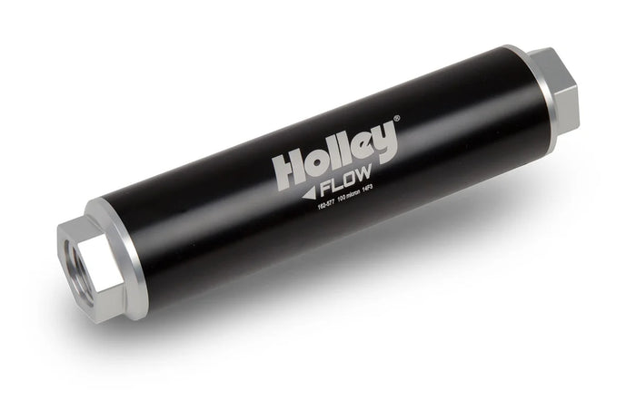 Description_MKT | Holley's new VR Series Billet Fuel Filters are part of the complete VR Series Fuel Systems product line. VR Series Billet fuel filters are precision CNC machined from 6061-T6 billet aluminum for strength and durability. They feature a black bright dip anodized body and clear bright dip anodized ends for superior corrosion resistance and good looks. The Holley 162-577 fuel filter features - 12 AN inlet and outlet ports. Replacement elements are also available. |