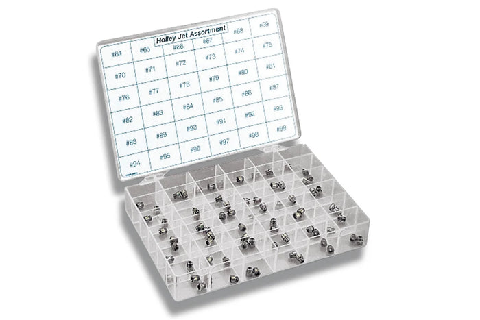| Description_MKT | The Holley jet assortment kit is the professional way to track-tune your Holley carburetor for top performance. This kit consists of two (2) each of thirty-six (36) different jet sizes, ranging from #64 to #99. The jets are contained in a plastic case that is designed to keep them separated and make them easily accessible. Jet sizes selected will give the broadest range of adjustment and tuning for most performance carburetor applications. |