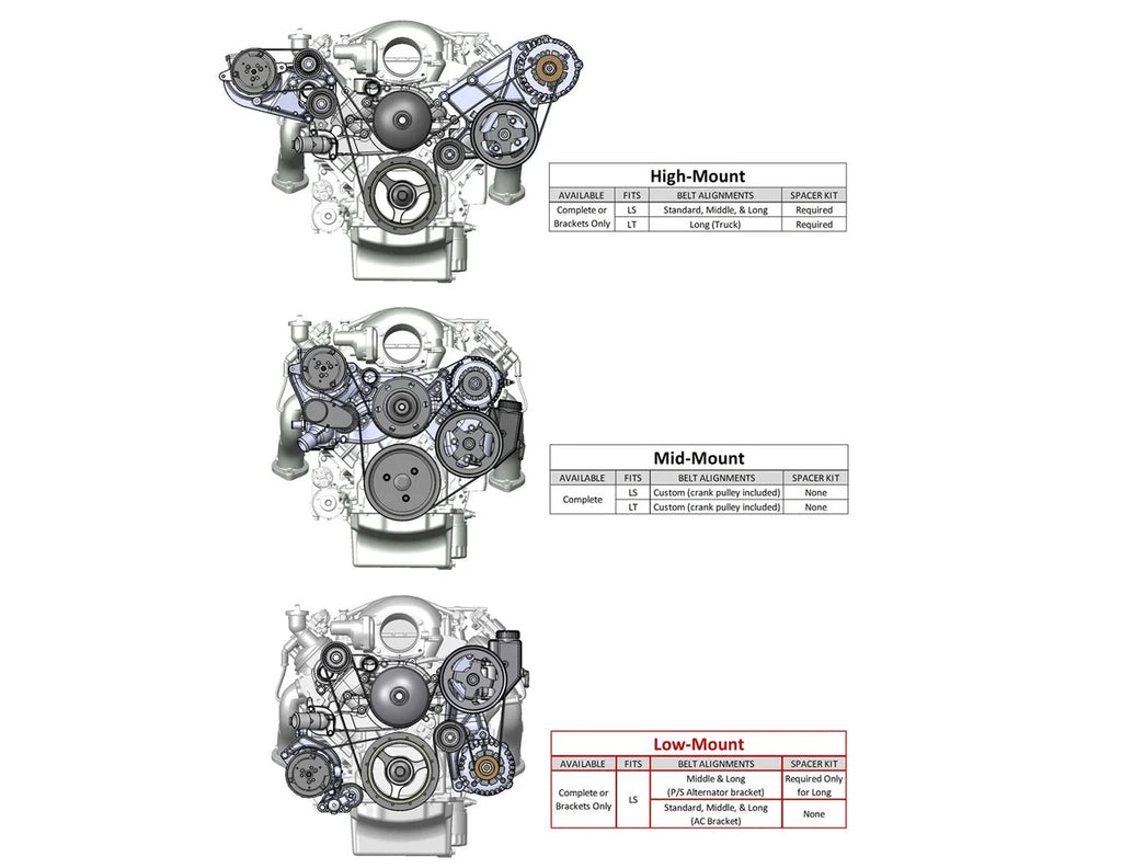 | Description_MKT | "Holley's new Low Mount Accessory Drive Brackets and Complete Systems have the components tucked in tighter to the block and mounted lower for a more attractive and compact package. Ideal for LS engine swaps with limited space or where a low, more attractive appearance is desired. |