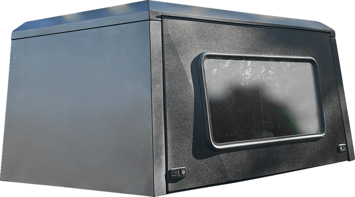 Weather-tight enclosure with weather stripping included. Rust-proof aluminum construction. Bolt-on application. Removable for adaptable use. Flush-mount latches. Convenient dome light with plug-n-play harness. Preserves dump bed function. Hoppe durable scratch-resistant textured coating. Lightweight at 65 lbs for limited impact on cargo capacity. 100 lbs roof cargo limit (with optional Roof Rack).