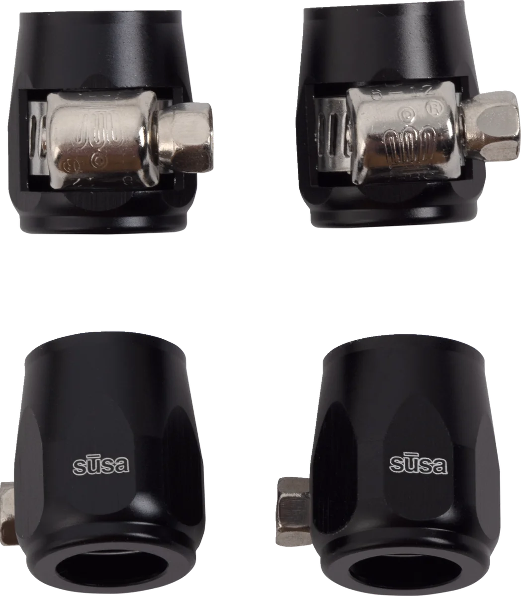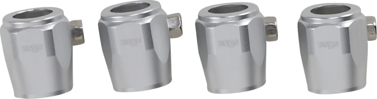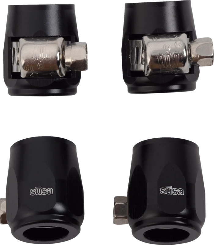 Hose finishers with integrated worm-drive hose clamps. Hose finishers are designed to fit over push-on style single-barbed hose ends and will not fit over AN-style adapter fittings or Jagg/susa AN-PushLock hose ends. Size 7/8" integrated hose clamps, suitable for 3/8"(-06) plain rubber or braided/jacketed oil hose. Aluminum construction. Hose finishers are designed to fit over push-on style single-barbed hose ends. Will not fit over AN-style adapter fittings or Jagg/Susa AN-PushLock hose ends..